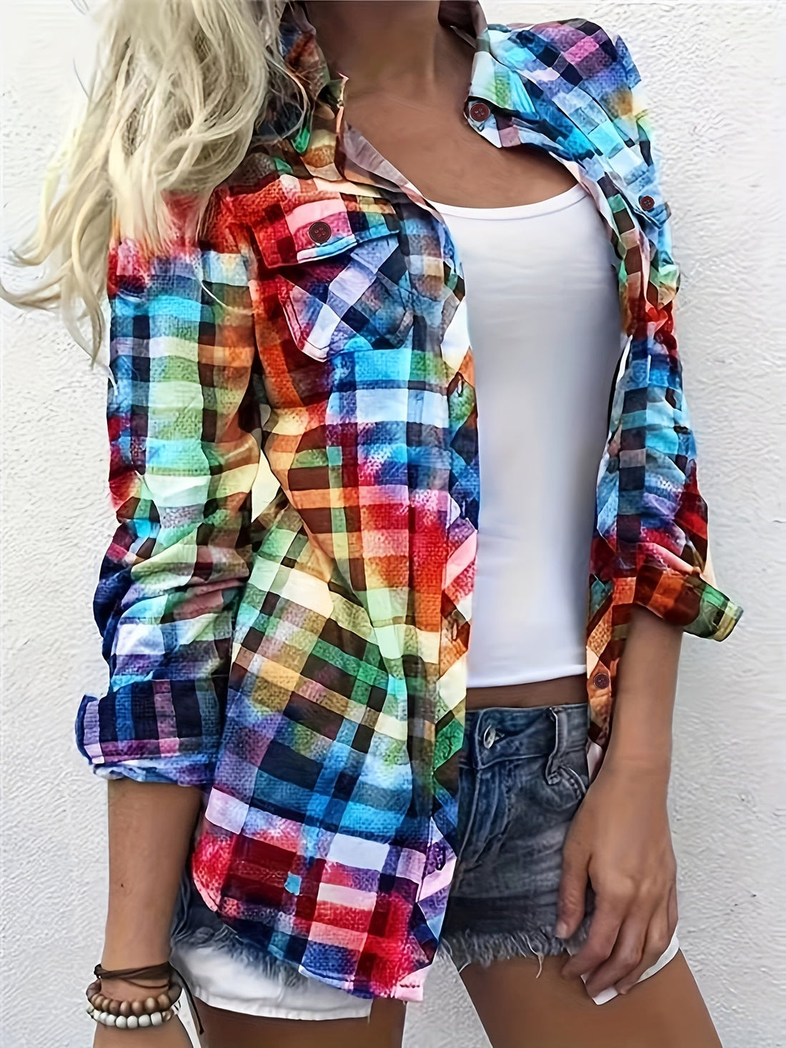 Sale Colorful Plaid Print Shirt, Casual Long Sleeve Button Front Shirt With A Collar