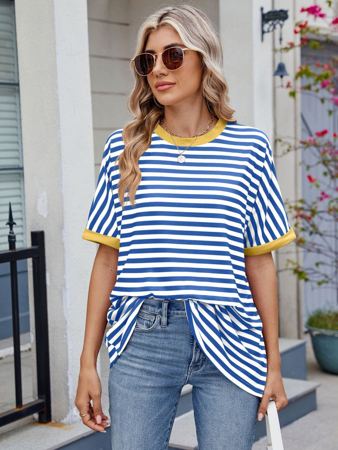 Sale Crew Neck Sleeve Striped Casual Short Sleeve T-Shirt