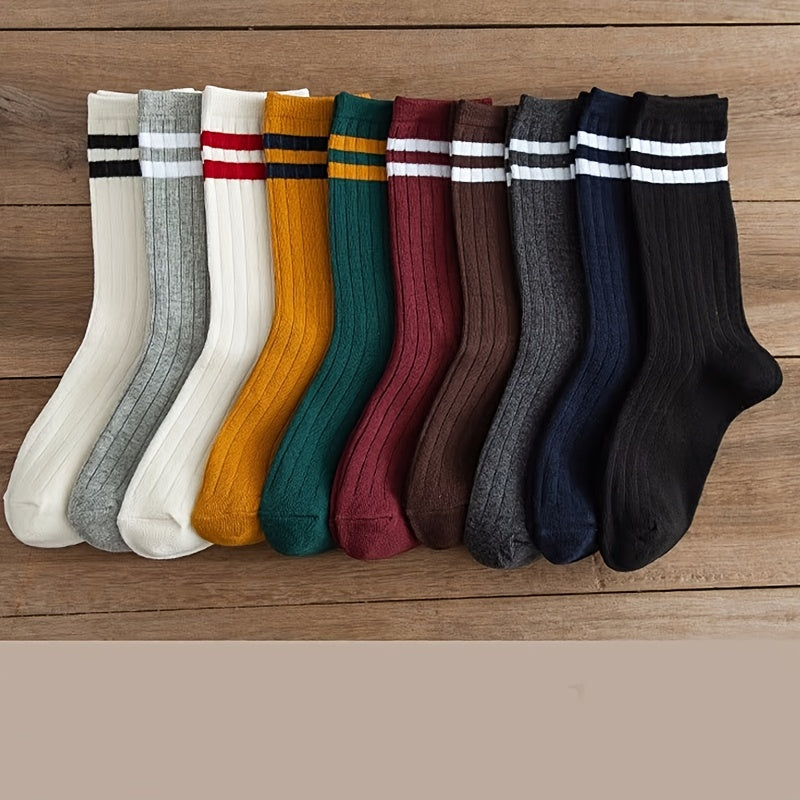 Sale 5/10 Pairs Solid Patched Stripes Crew Socks, Basic Sports Business Stockings