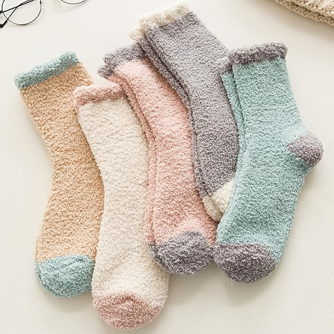 Sale 5 pairs Color Block Warm & Fuzzy Socks, Crew Length Warm Coral Fleece Socks