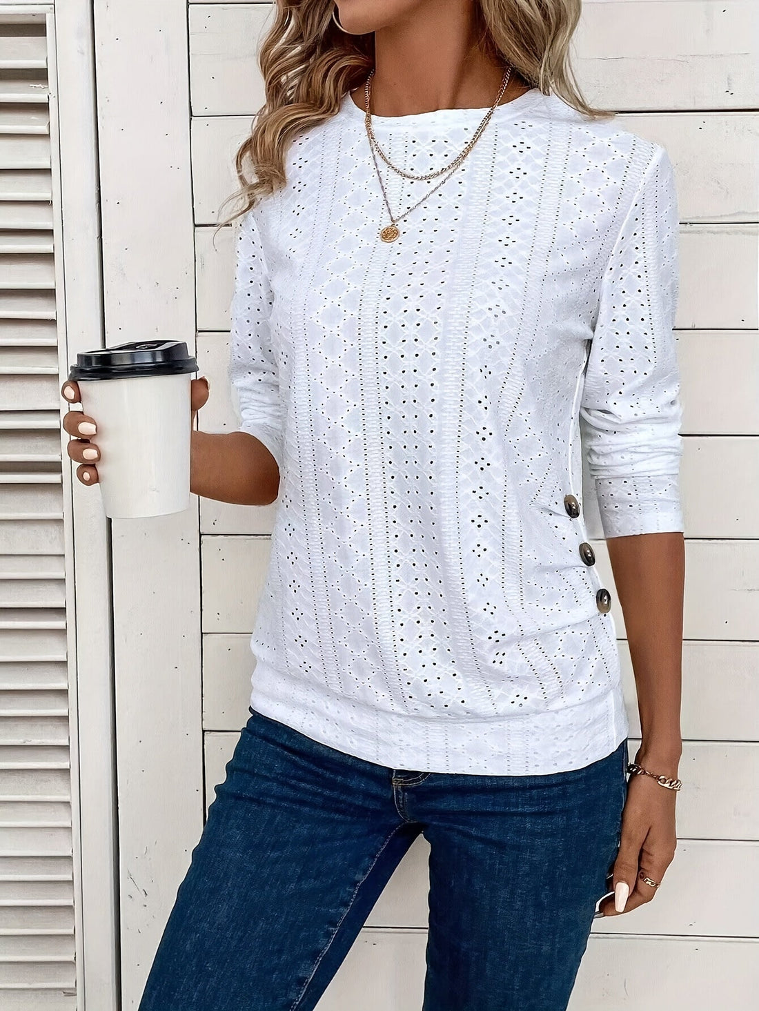 Sale Hollow Button Decor Crew Neck T-Shirt, Elegant Long Sleeve T-Shirt
