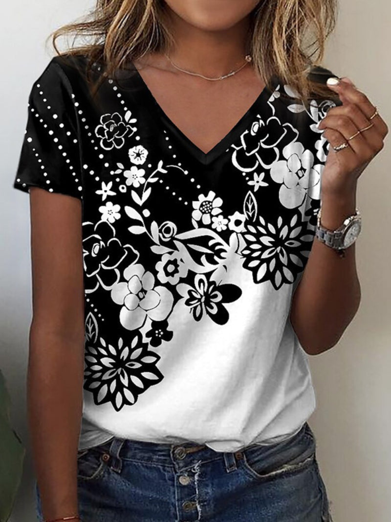 Sale Floral Print V Neck T-Shirt, Short Sleeve Casual Top