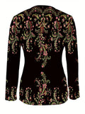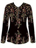 1pc Elegant Floral Pattern Long Sleeve V-Neck Zipper T-Shirt