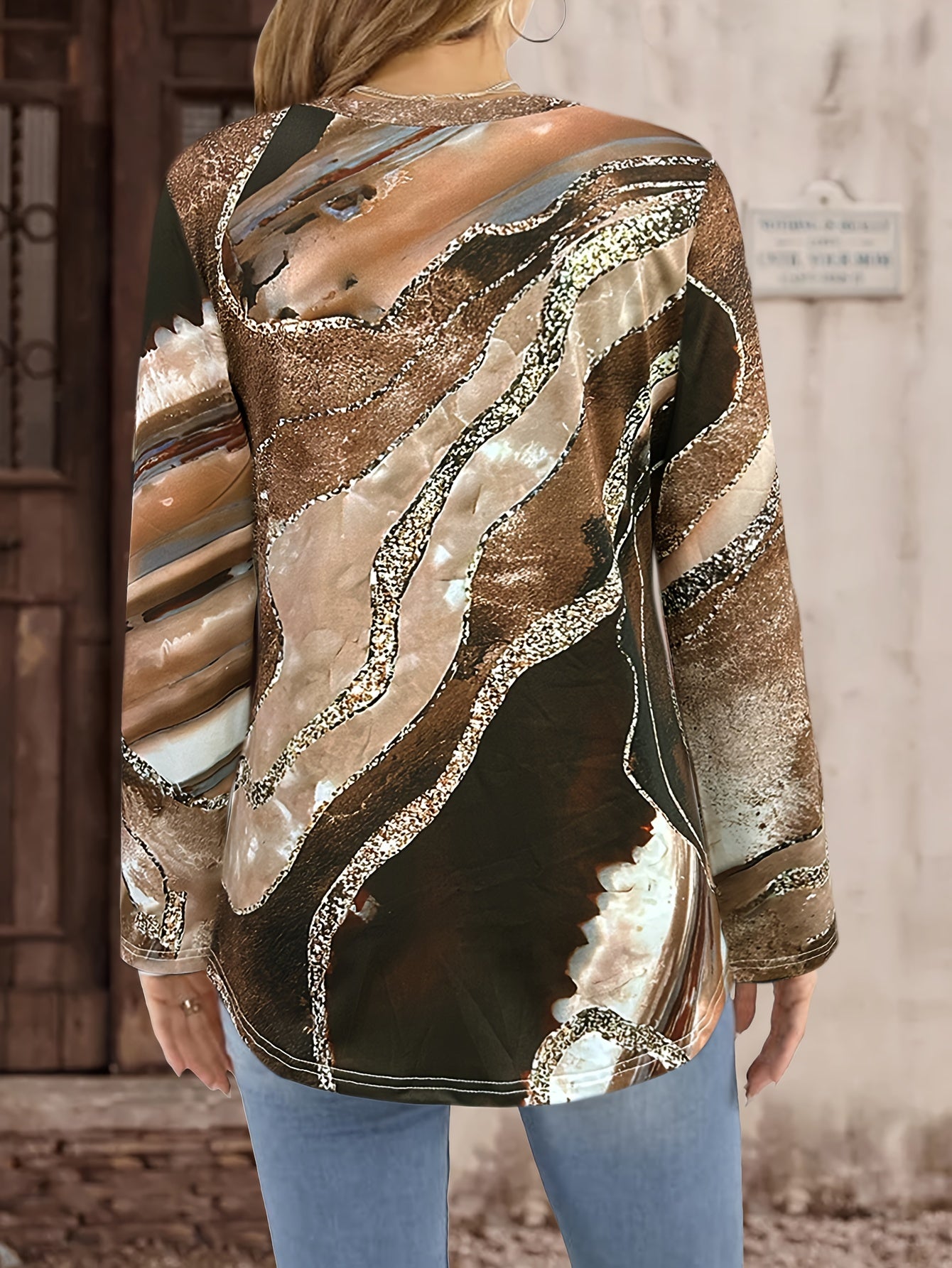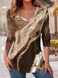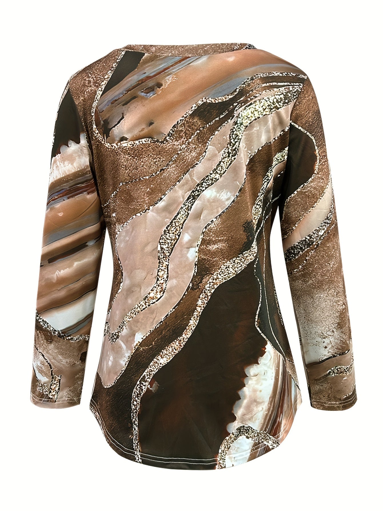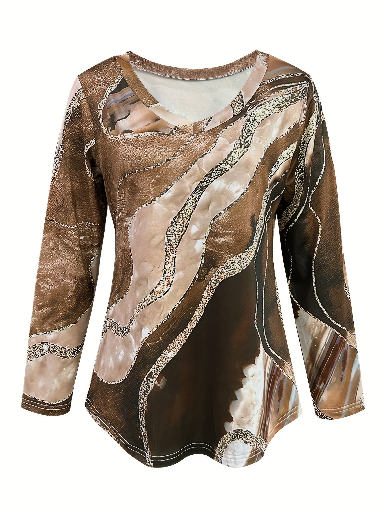 Abstract Print V Neck T-shirt, Long Sleeve T-shirt