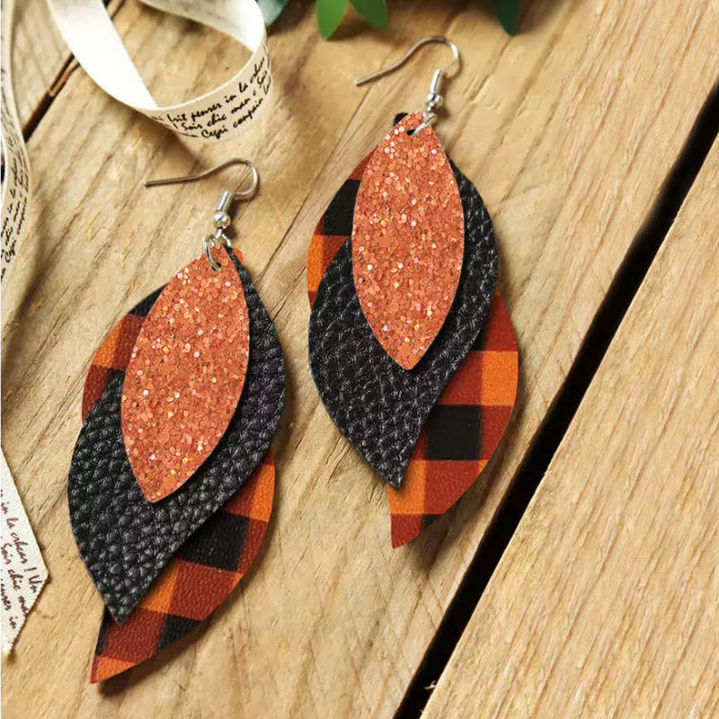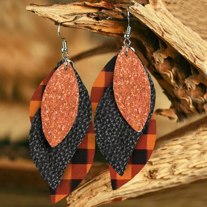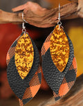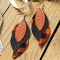 Retro Leaf Three-layer Sequined Leather Earrings Fashion Plaid Leather Earrings