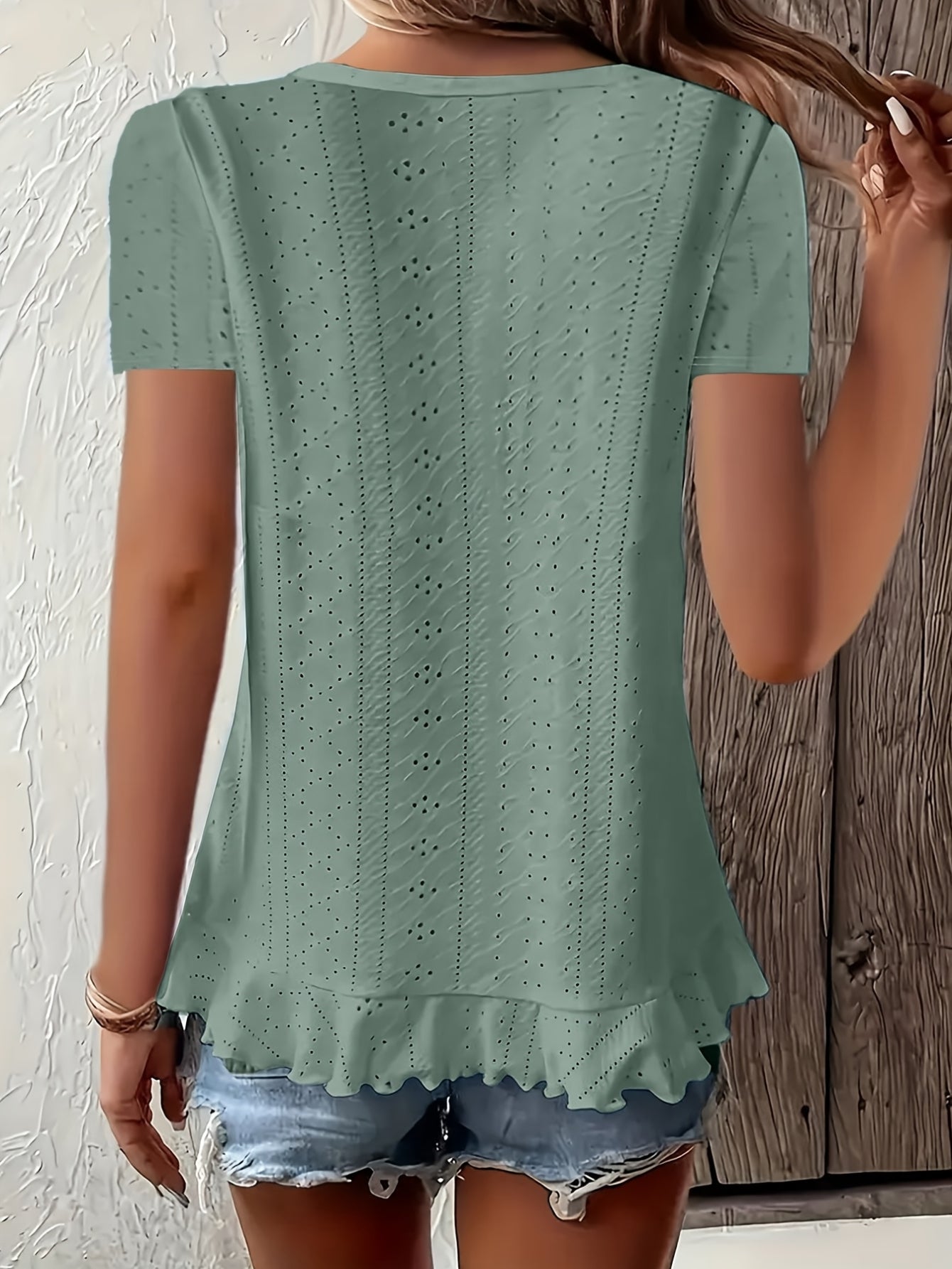 Sale Solid Pleated Trim Blouse, Casual Crew Neck Short Sleeve Blouse