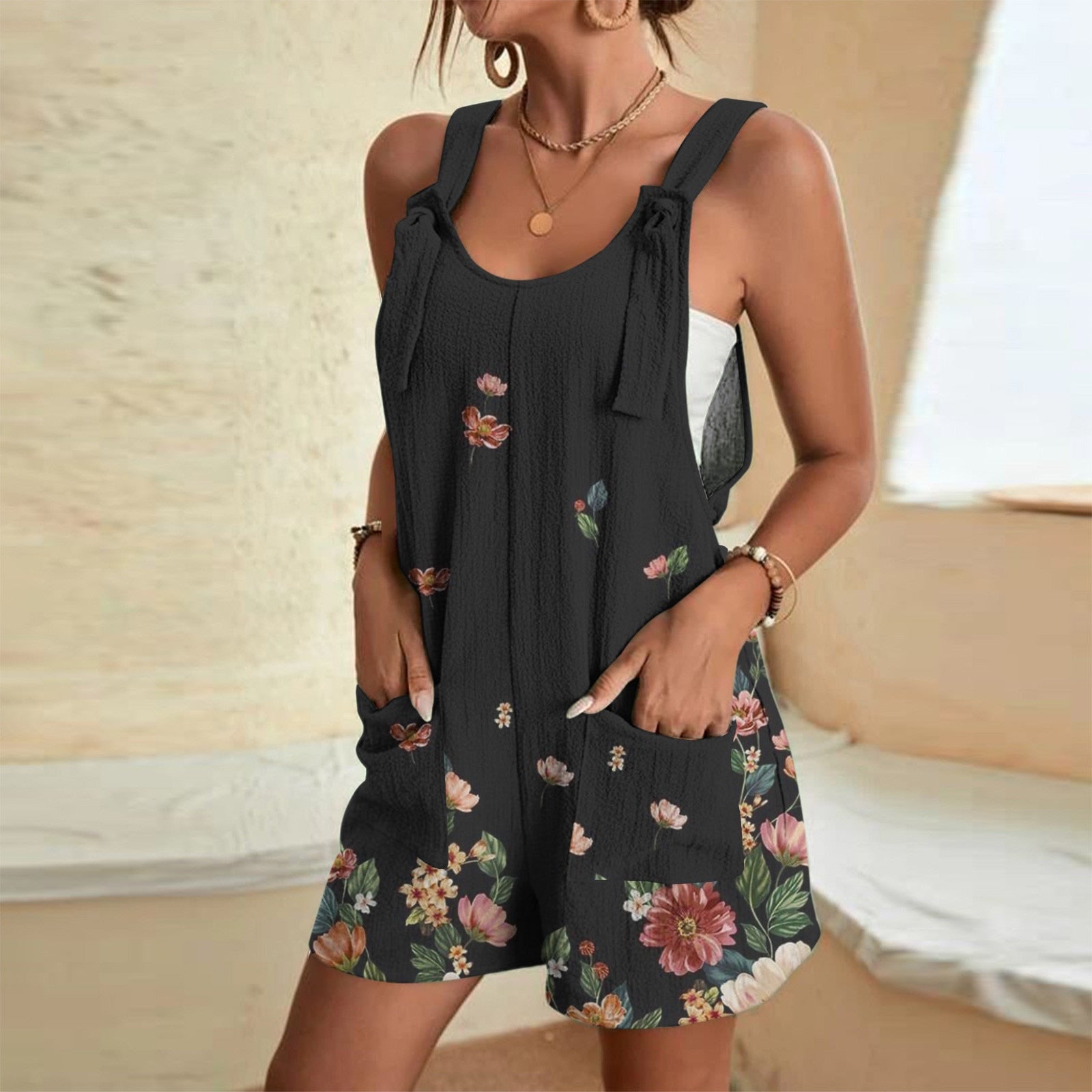 Sale Bohemian Floral Printed Short O Neck Sleeveless Elegant Shorts Loose Rompers with Pockets