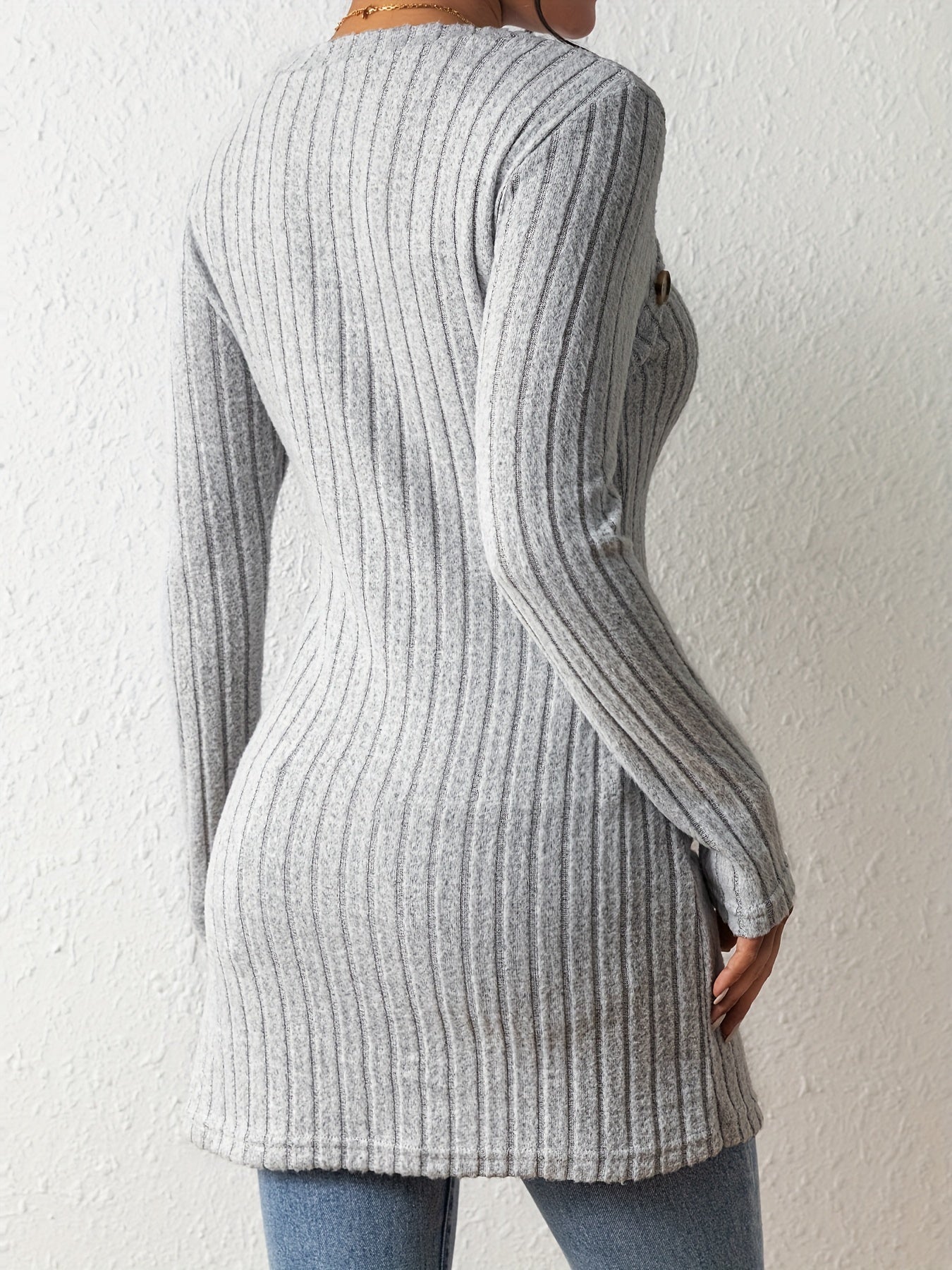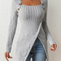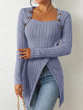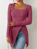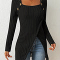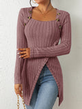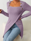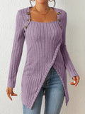 Sale Button Decor Asymmetrical Hem T-Shirt, Casual Ribbed Long Sleeve Top