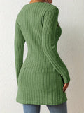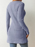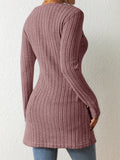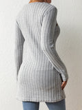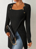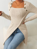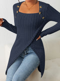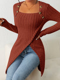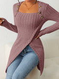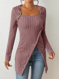 Button Decor Asymmetrical Hem T-Shirt, Casual Ribbed Long Sleeve Top