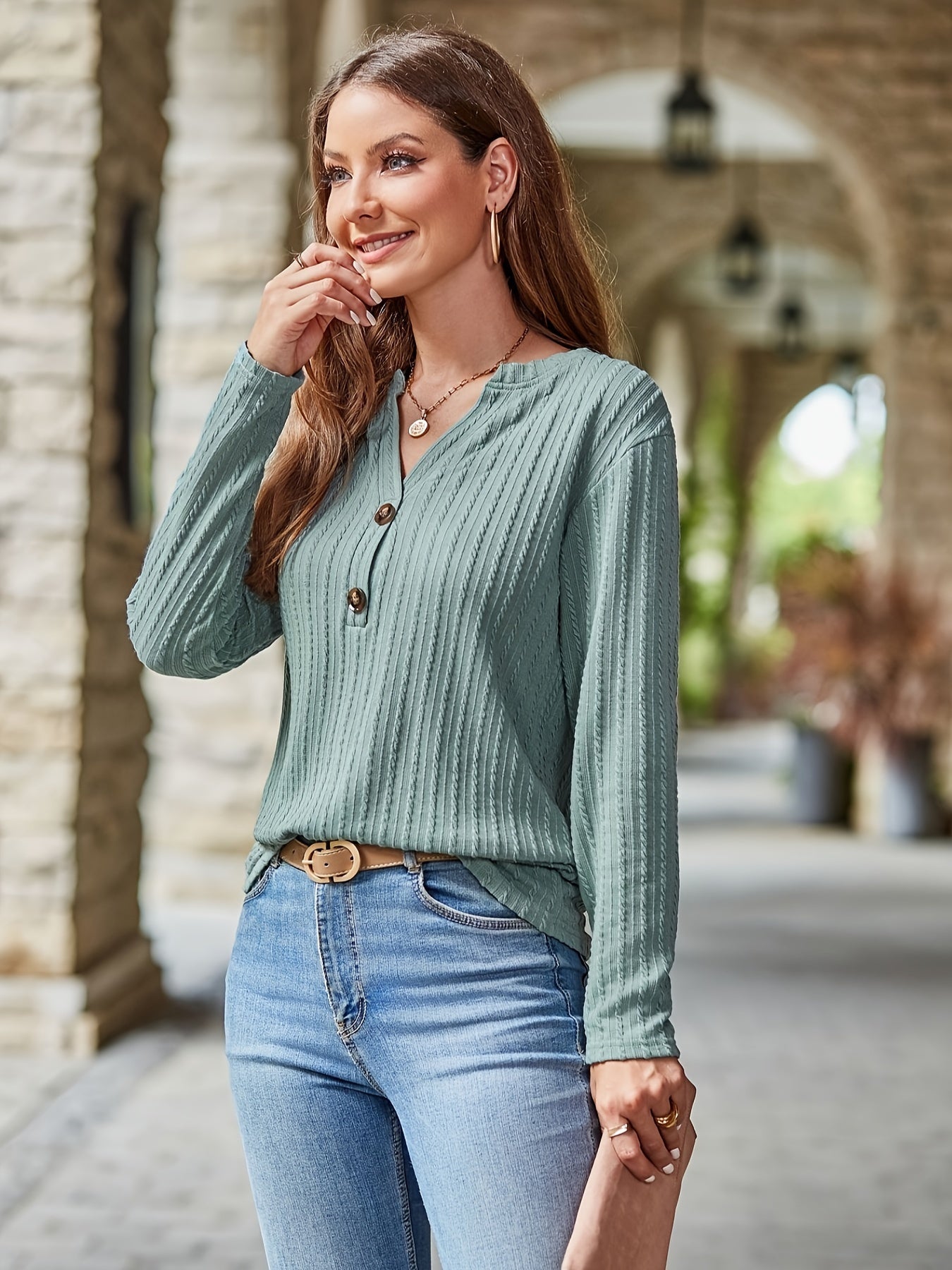Button Front Notch Neck Textured T-Shirt, Casual Long Sleeve T-Shirt