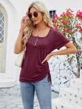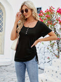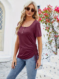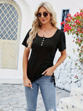 Button Front Scoop Neck T-shirt, Casual Drawstring Short Sleeve Top