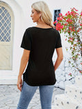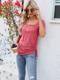 Sale Button Front Scoop Neck T-shirt, Casual Drawstring Short Sleeve Top
