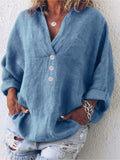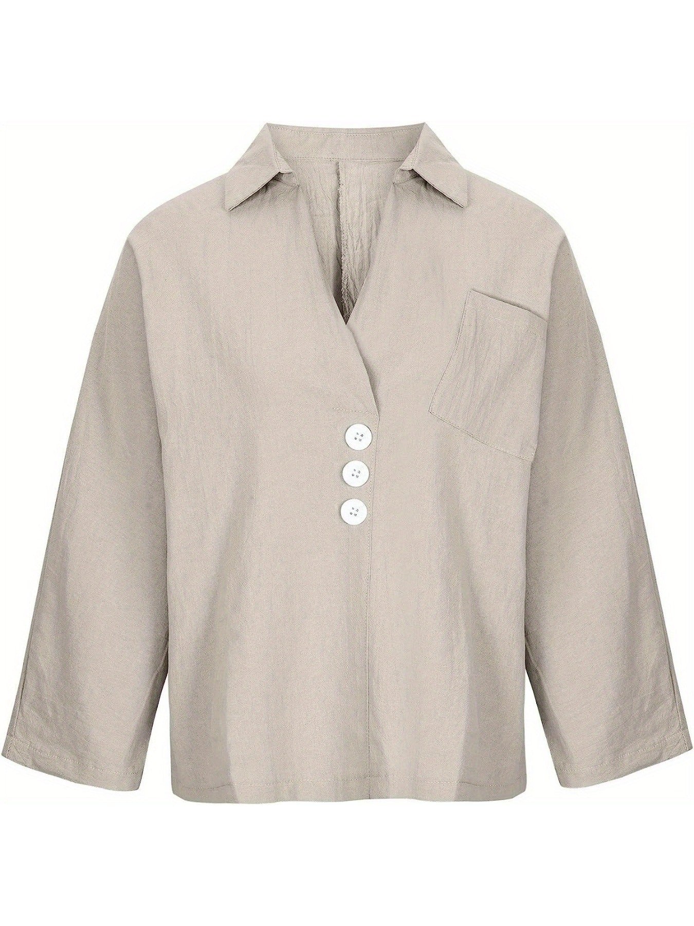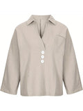 Button Front V Neck Blouse, Casual Pocket Long Sleeve Blouse