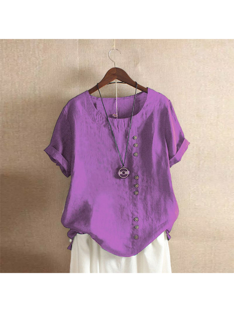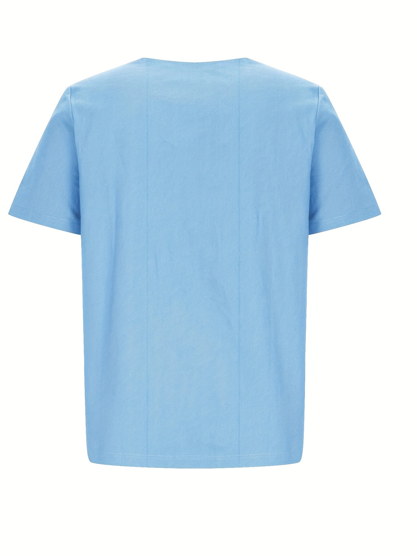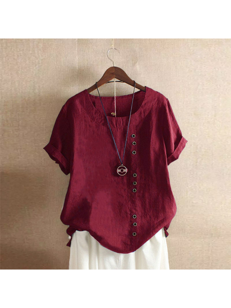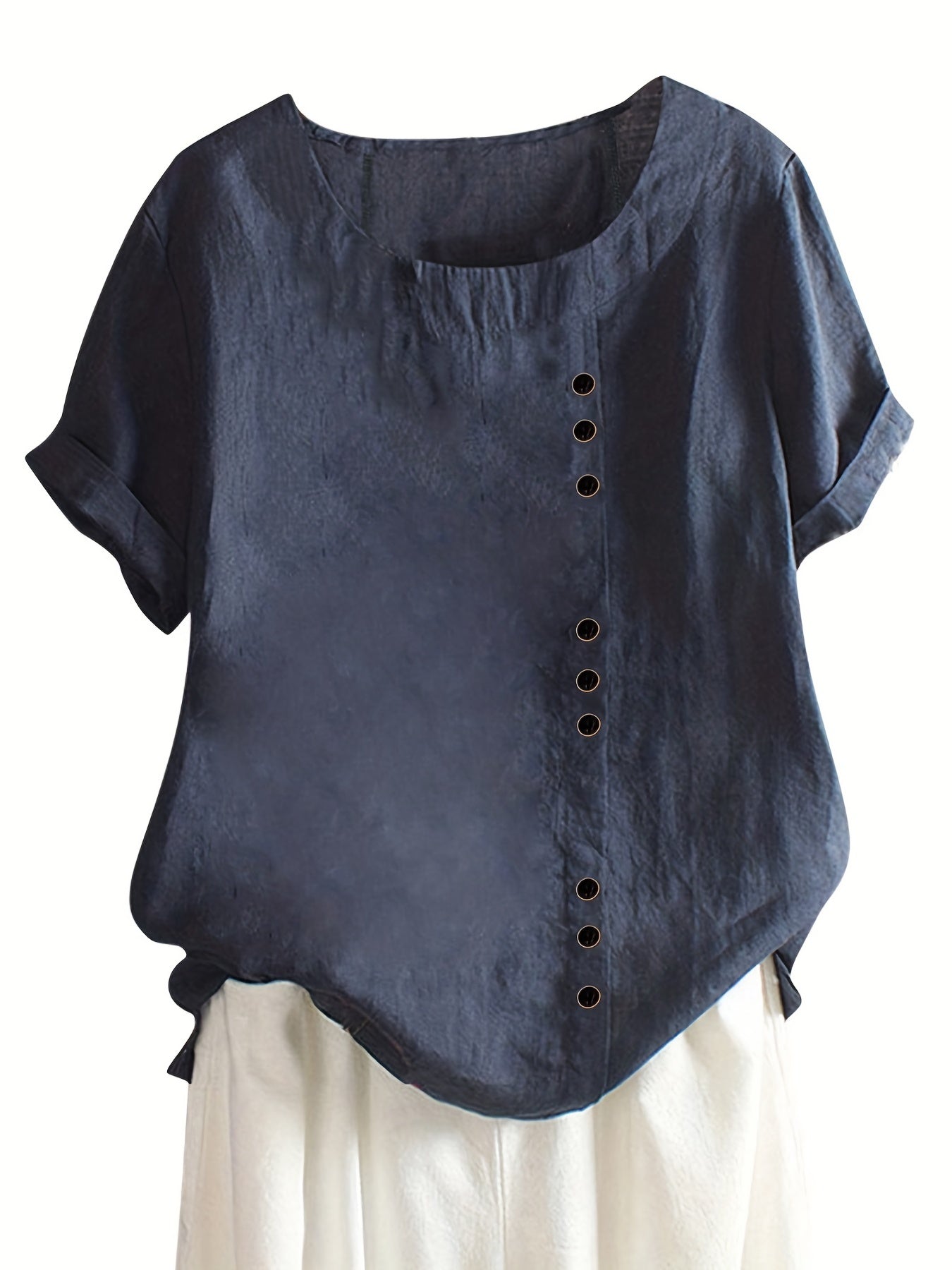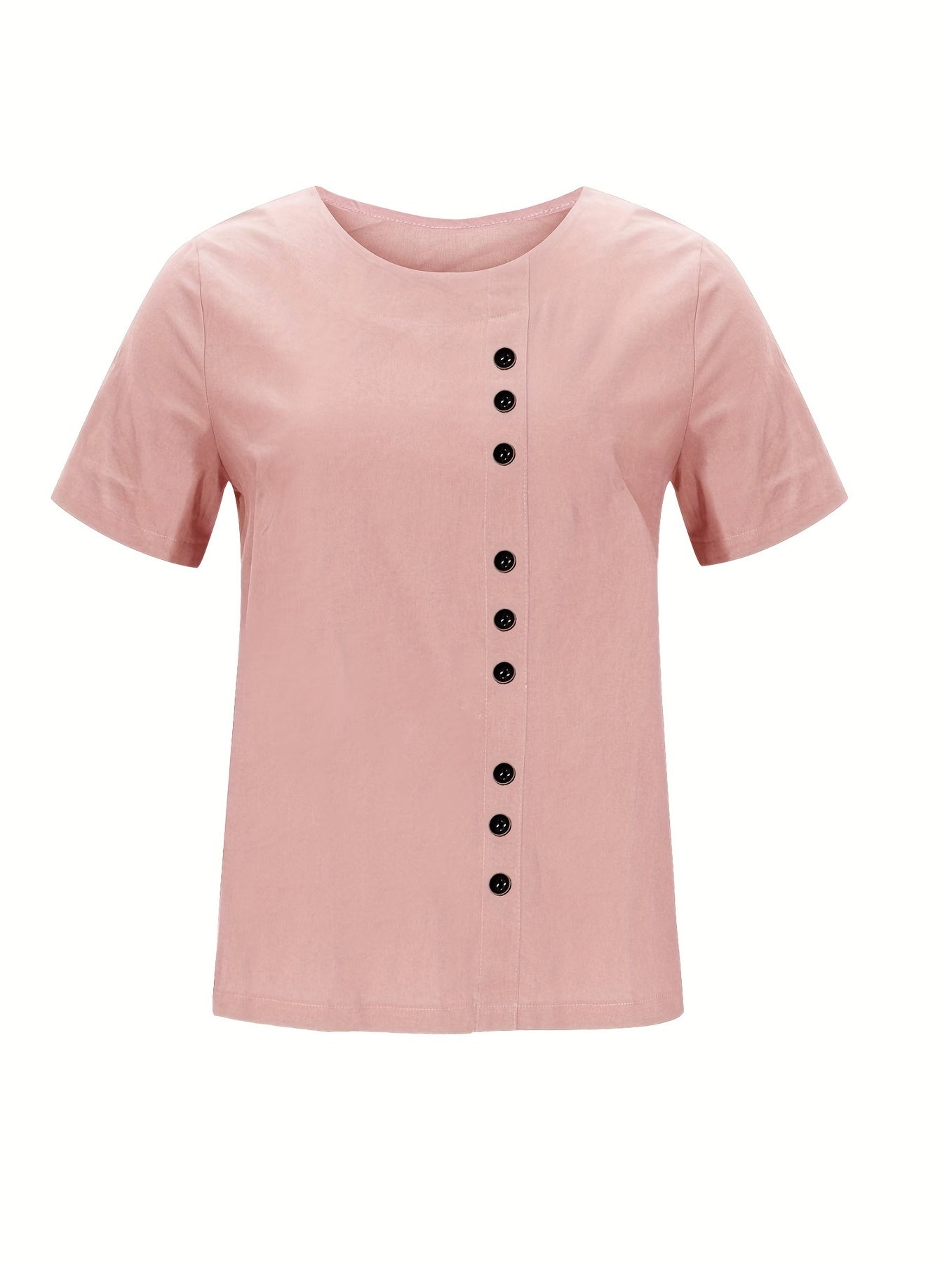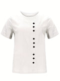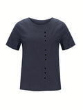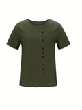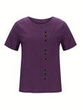 Sale Buttons Solid T-shirt, Casual Crew Neck Short Sleeve Summer T-shirt