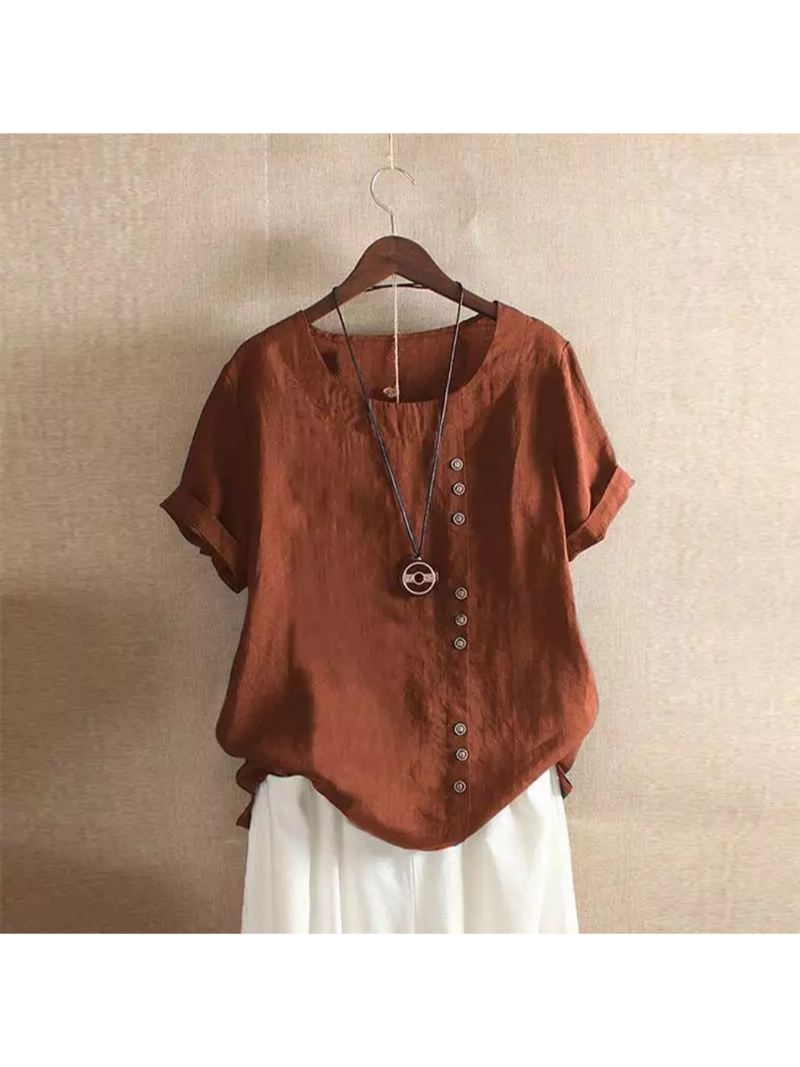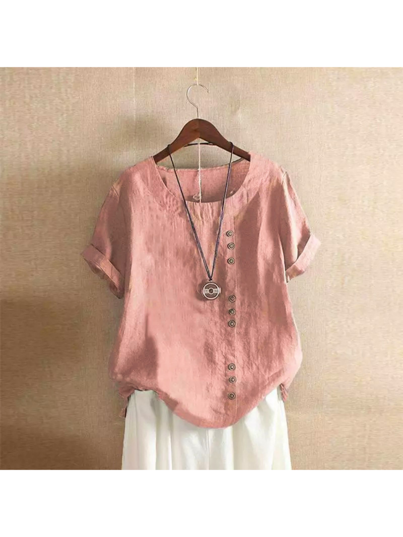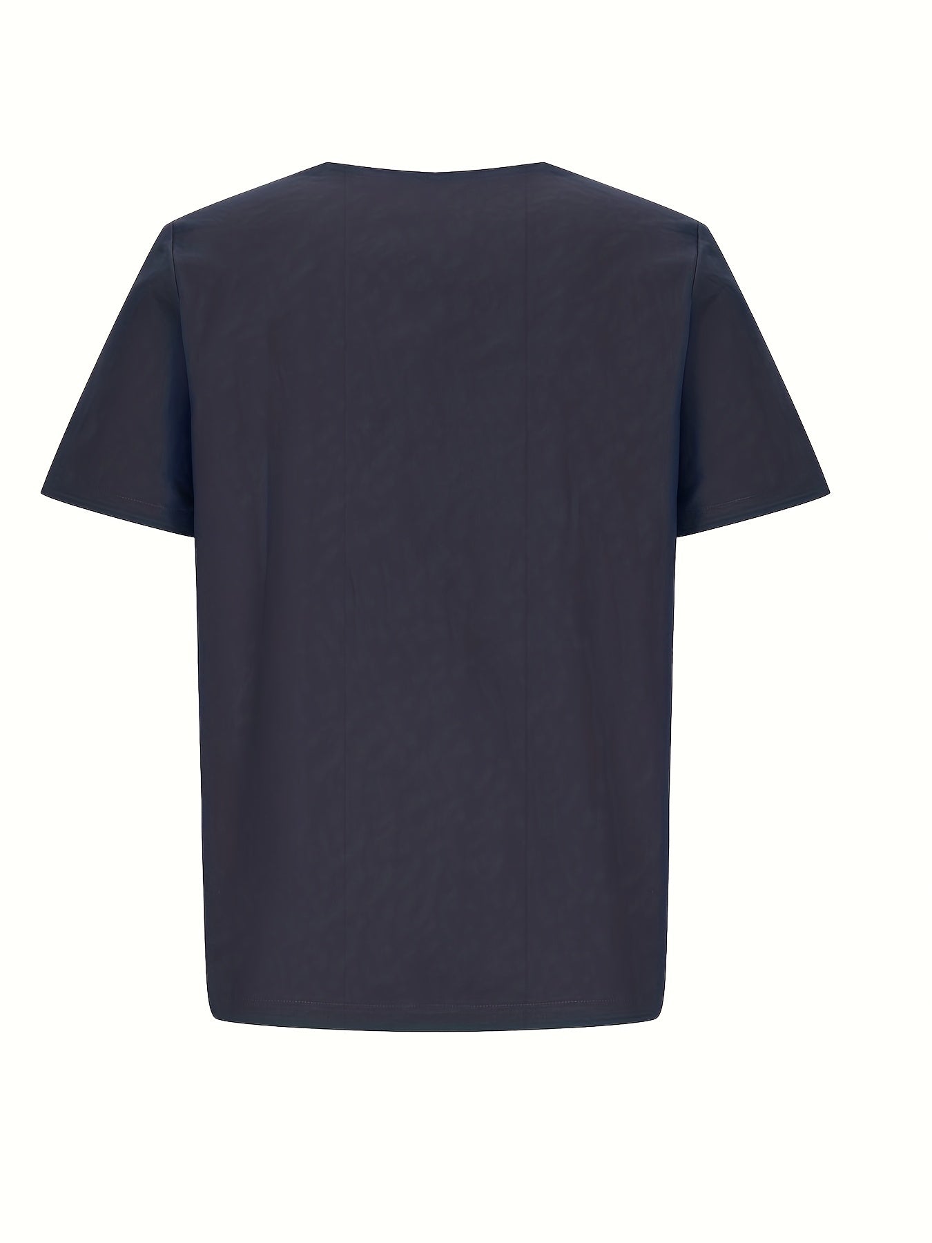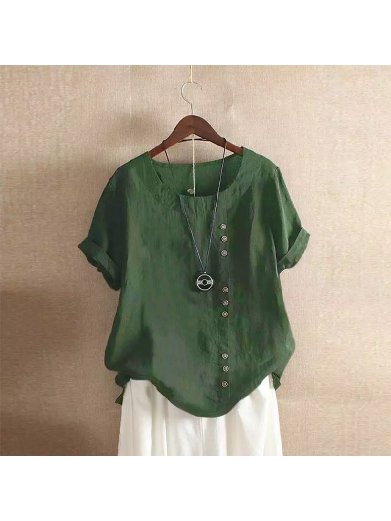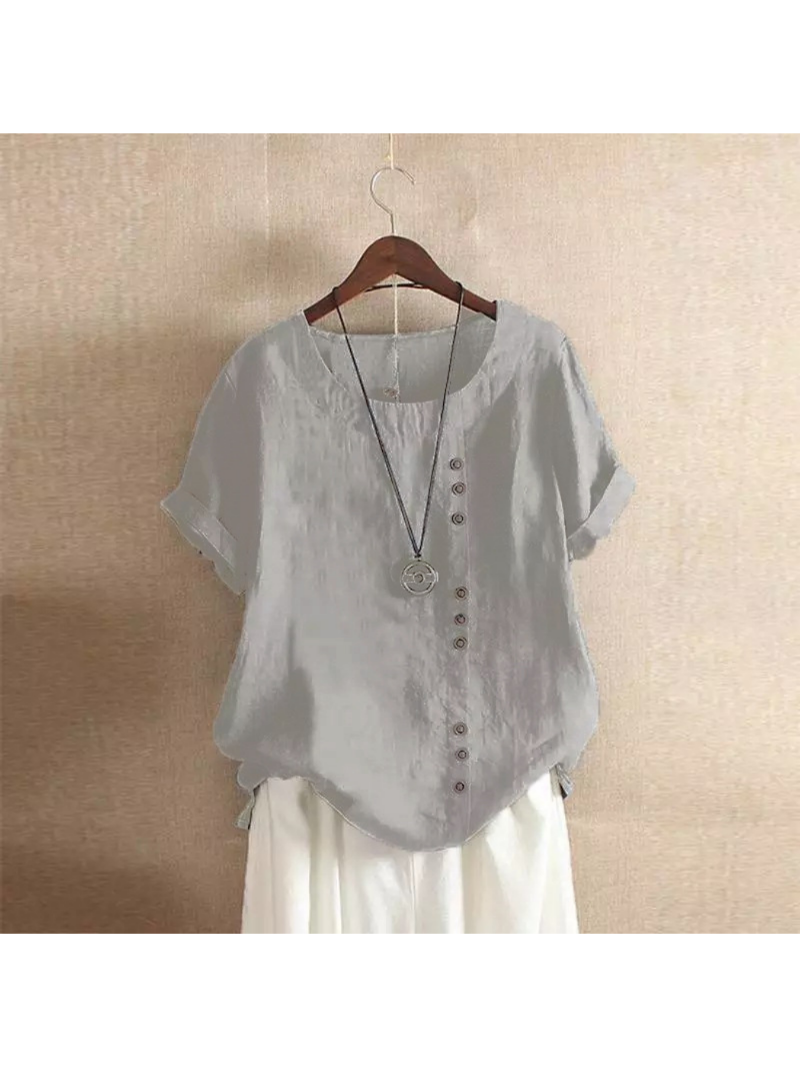 Sale Buttons Solid T-shirt, Casual Crew Neck Short Sleeve Summer T-shirt