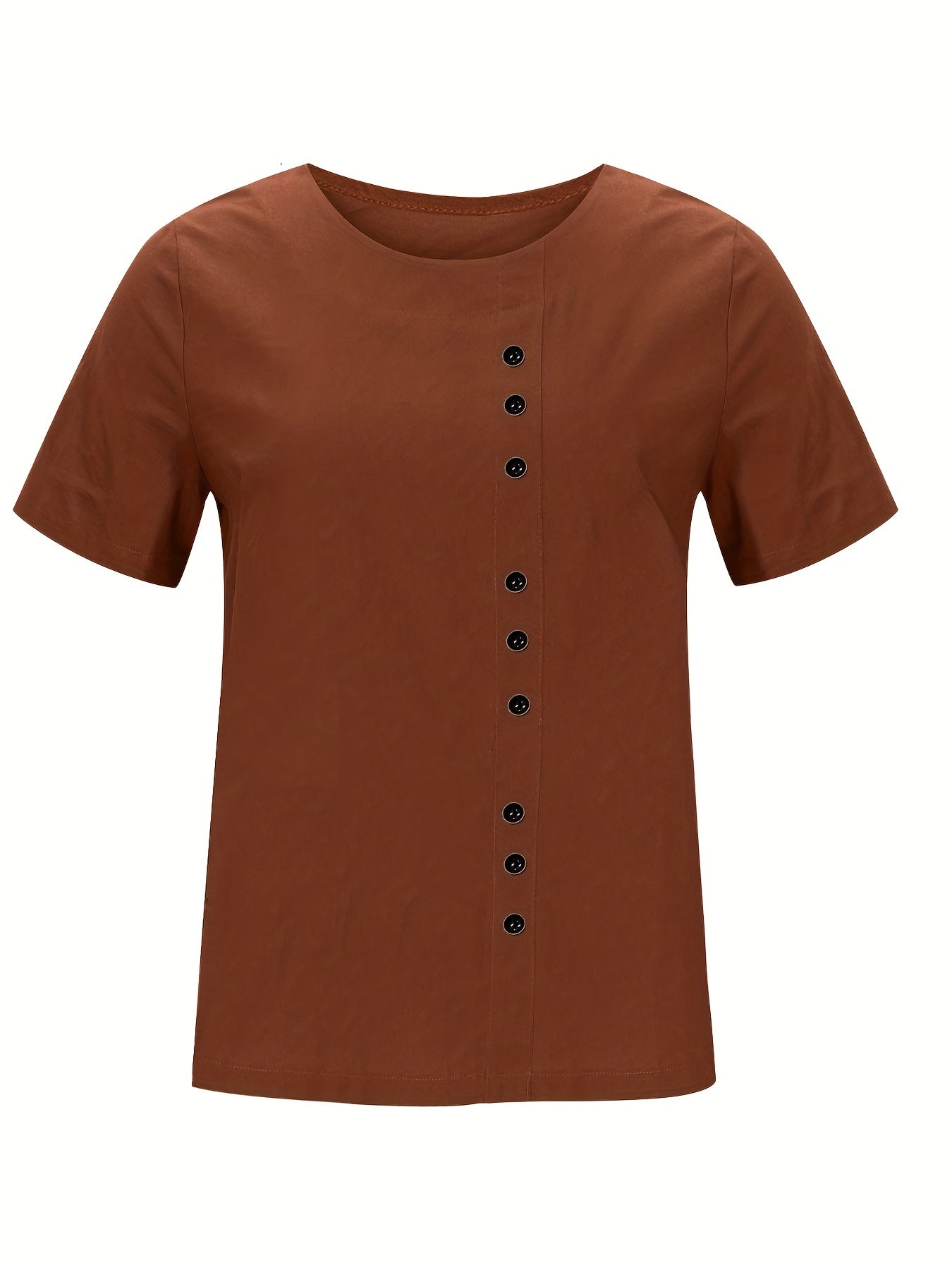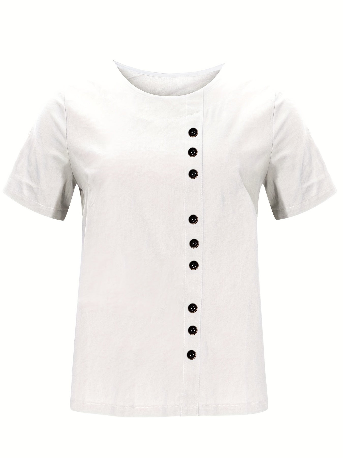 Buttons Solid T-shirt, Casual Crew Neck Short Sleeve Summer T-shirt