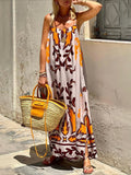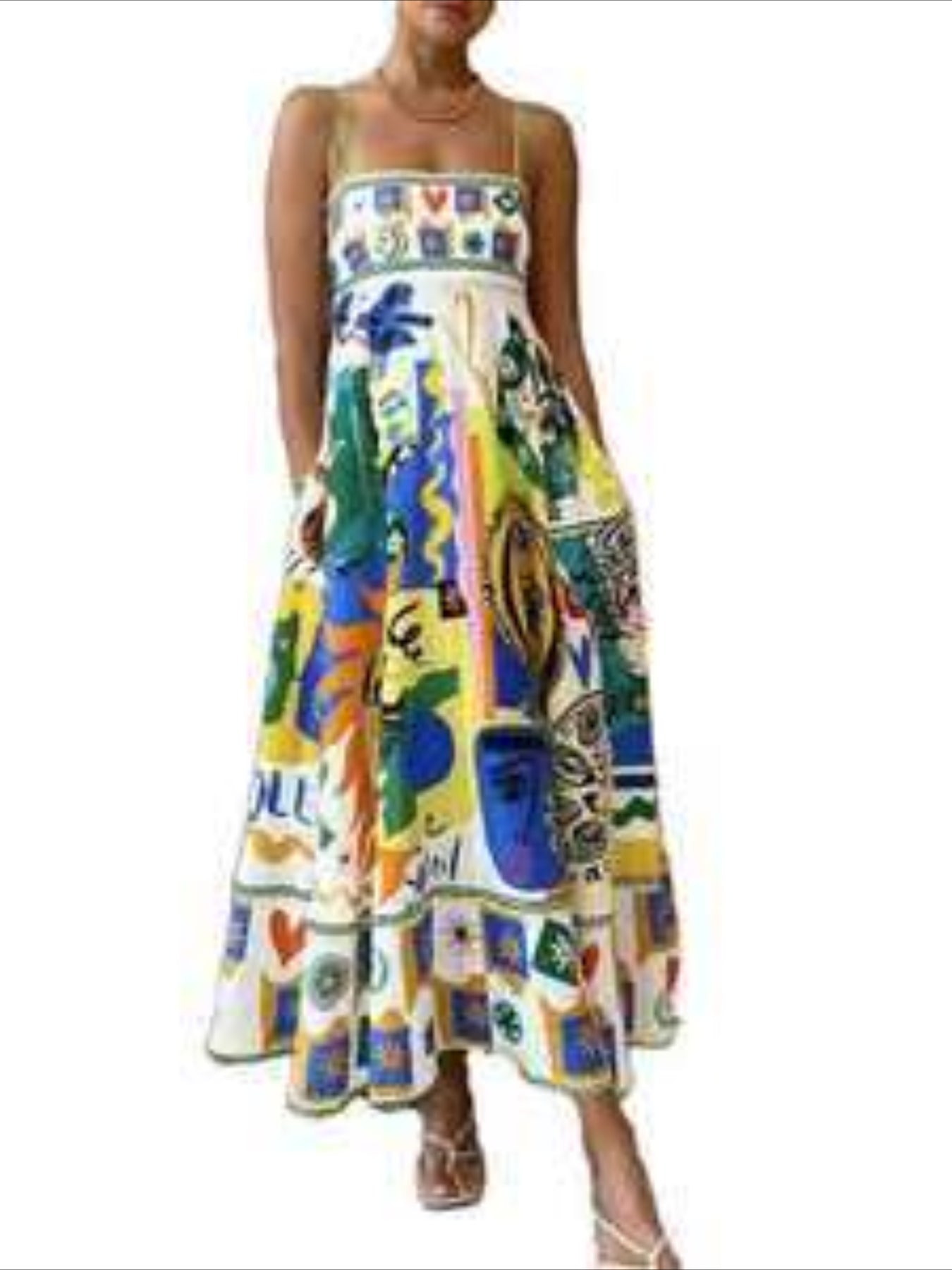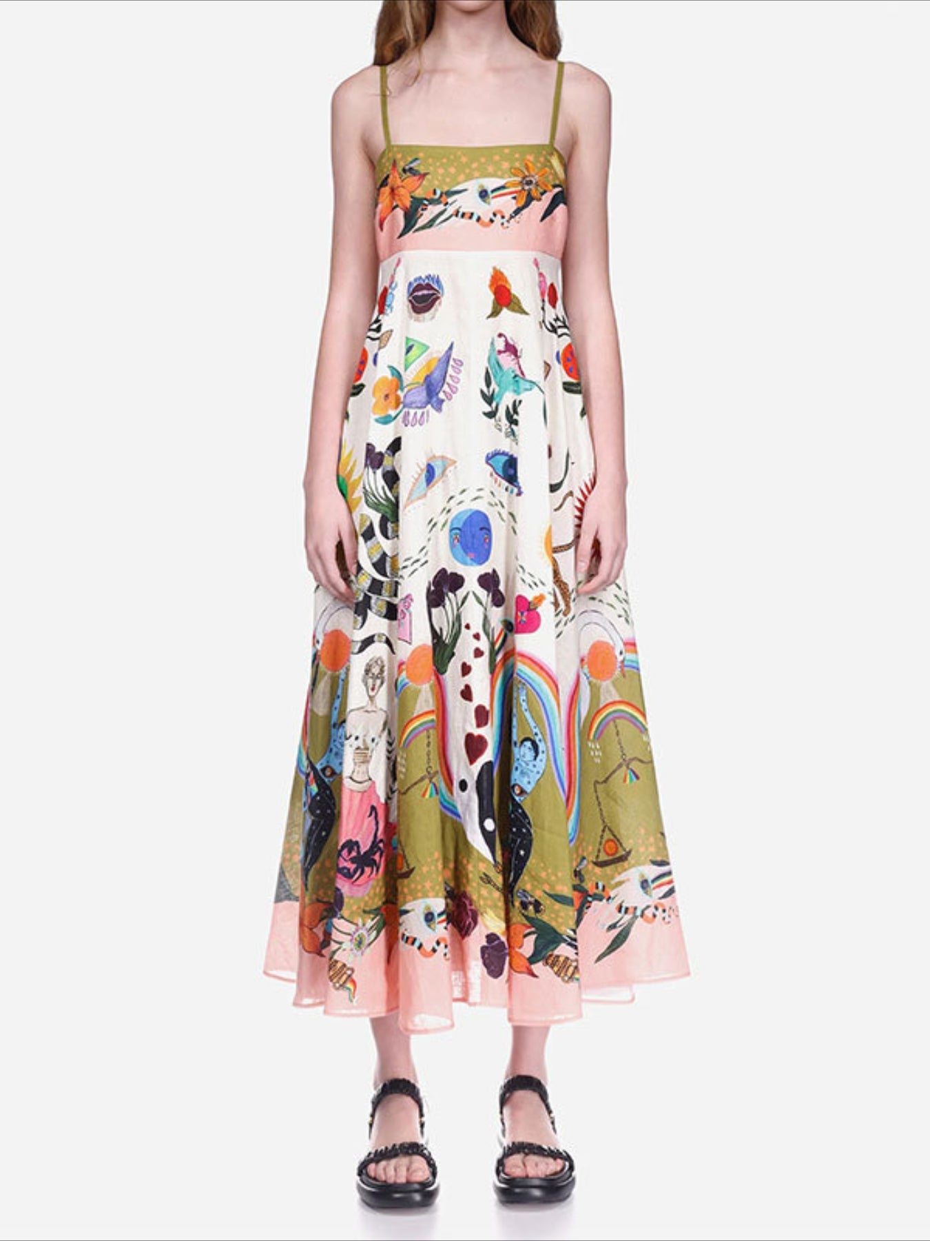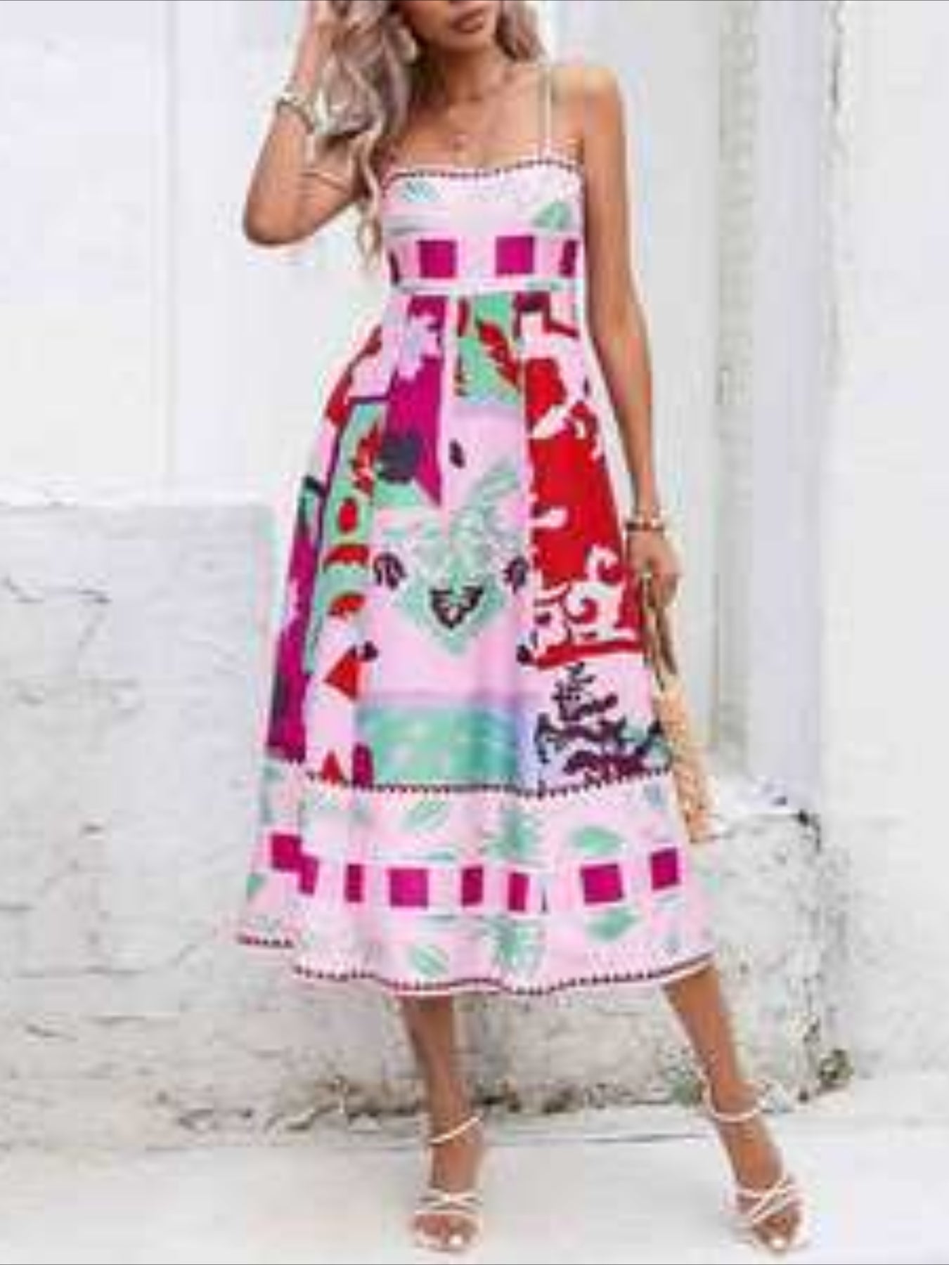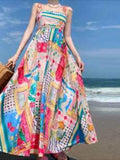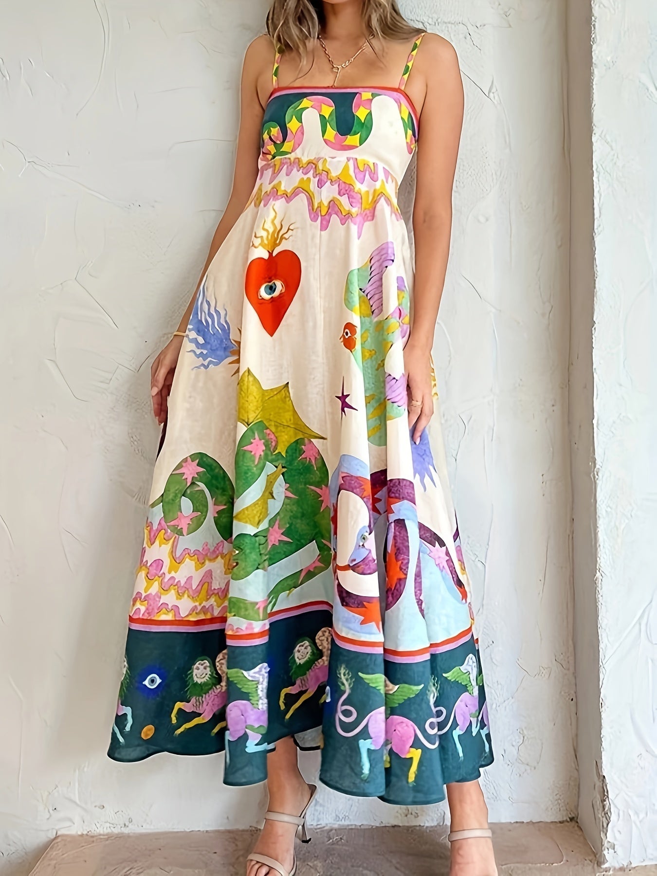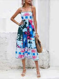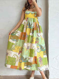 Sale Cartoon Drawstring Print Shirred Cami Dress, Elegant Sleeveless Spaghetti Strap Dress