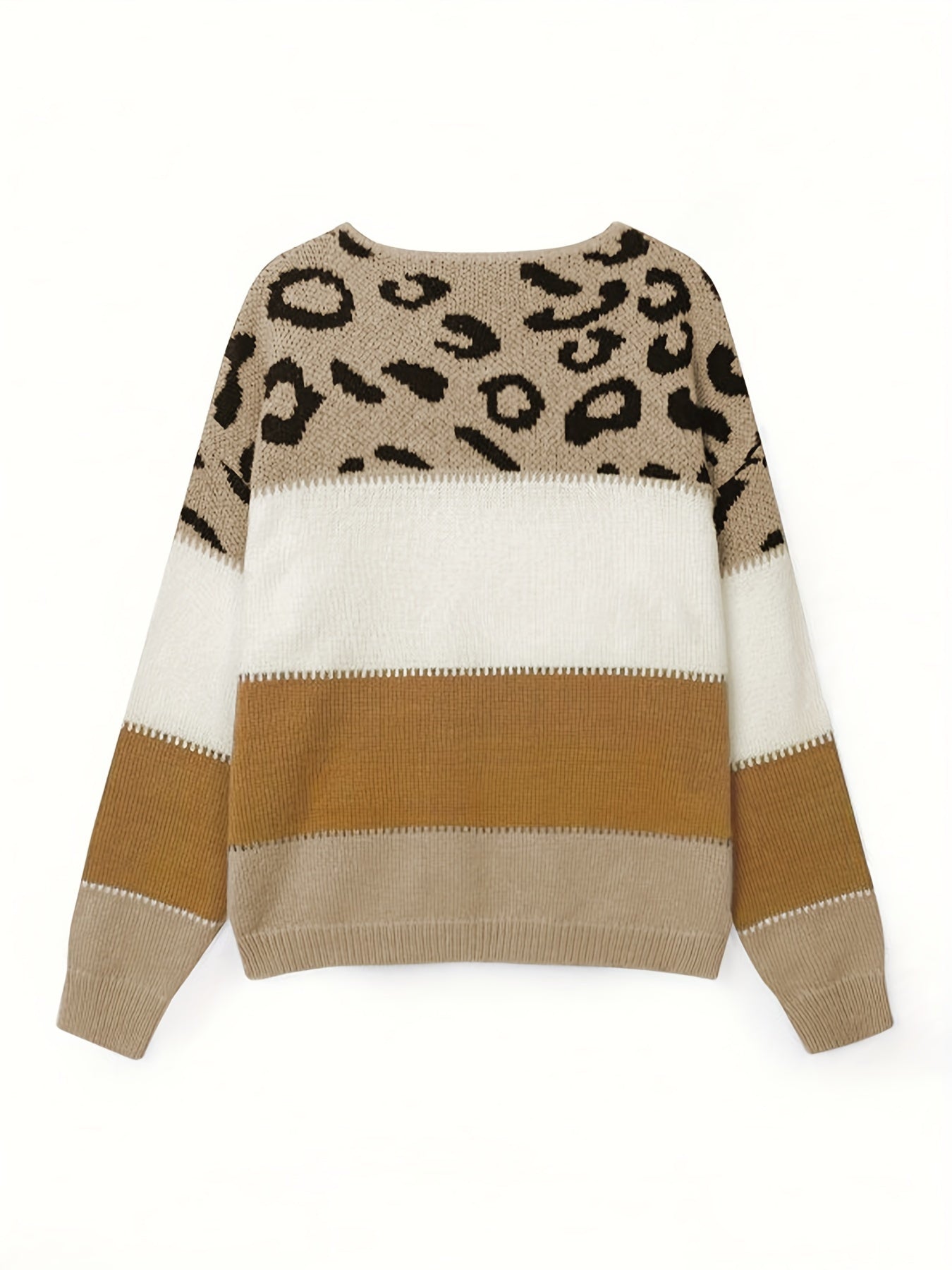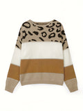 Chic Leopard Print Color Block Knit Sweater - Casual Crew Neck, Long Sleeve Pullover