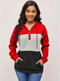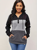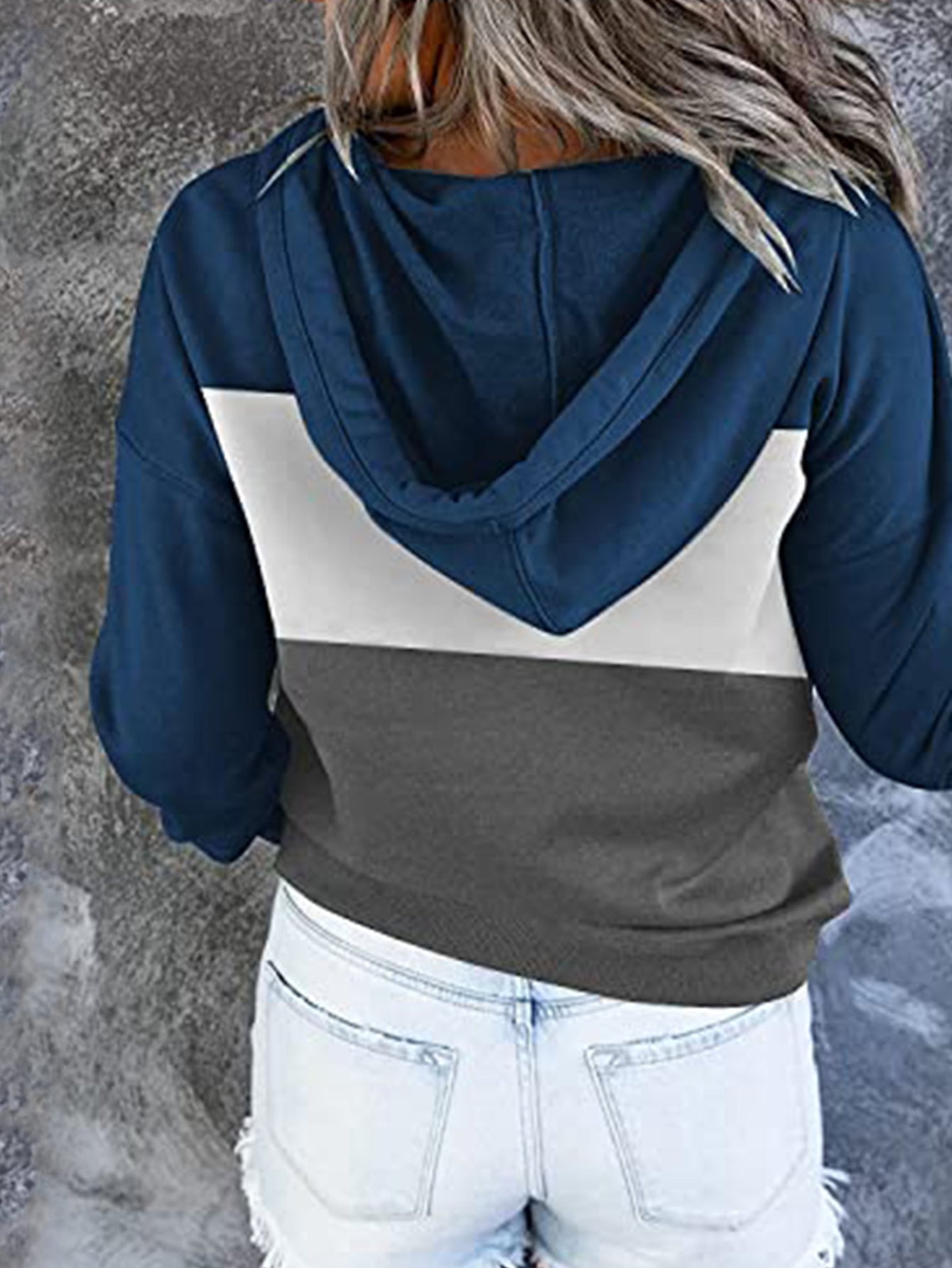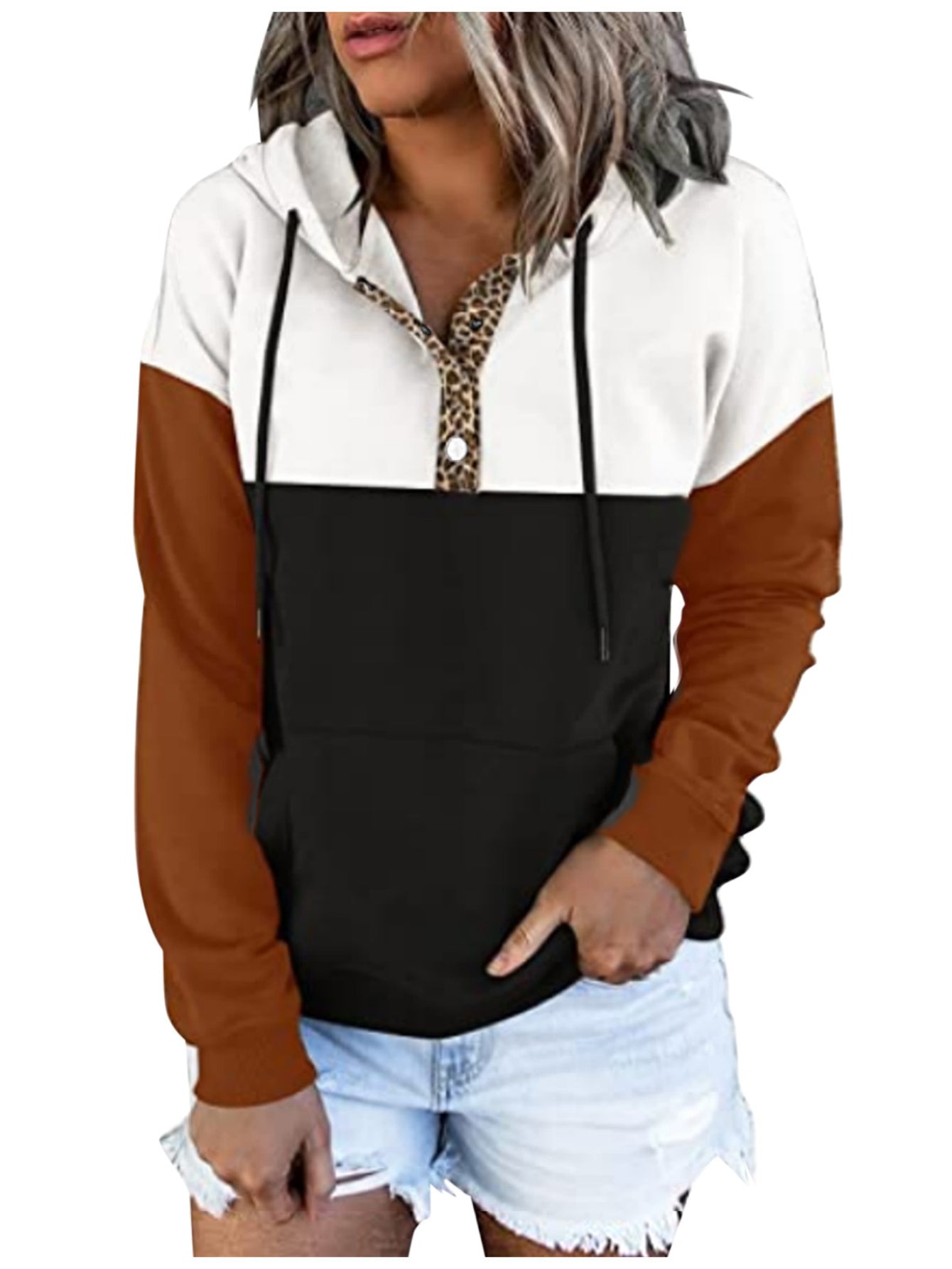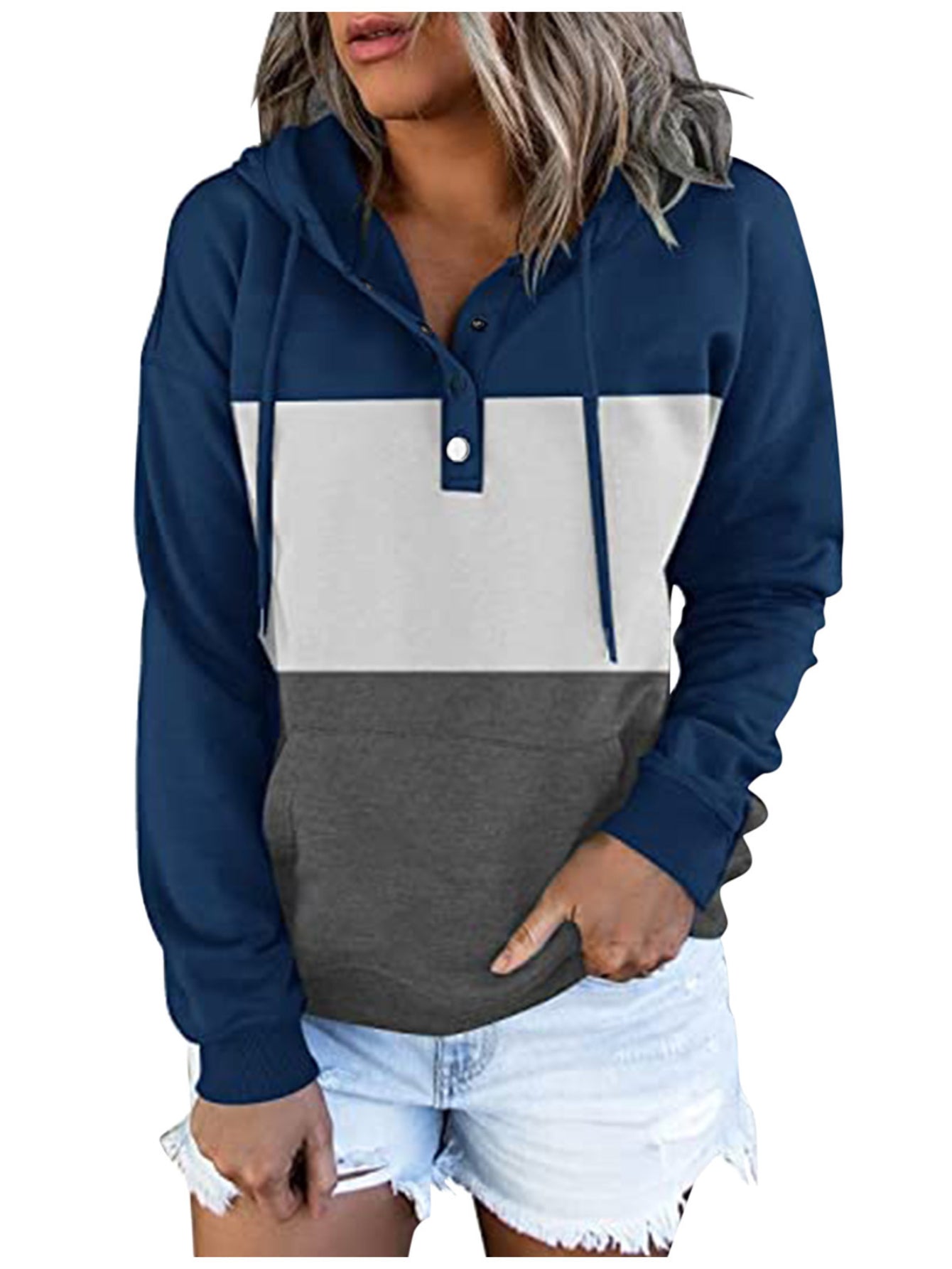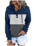 Sale Color Block Button Drawstring Hoodie, Casual Long Sleeve Kangaroo Pocket Sweatshirt