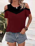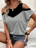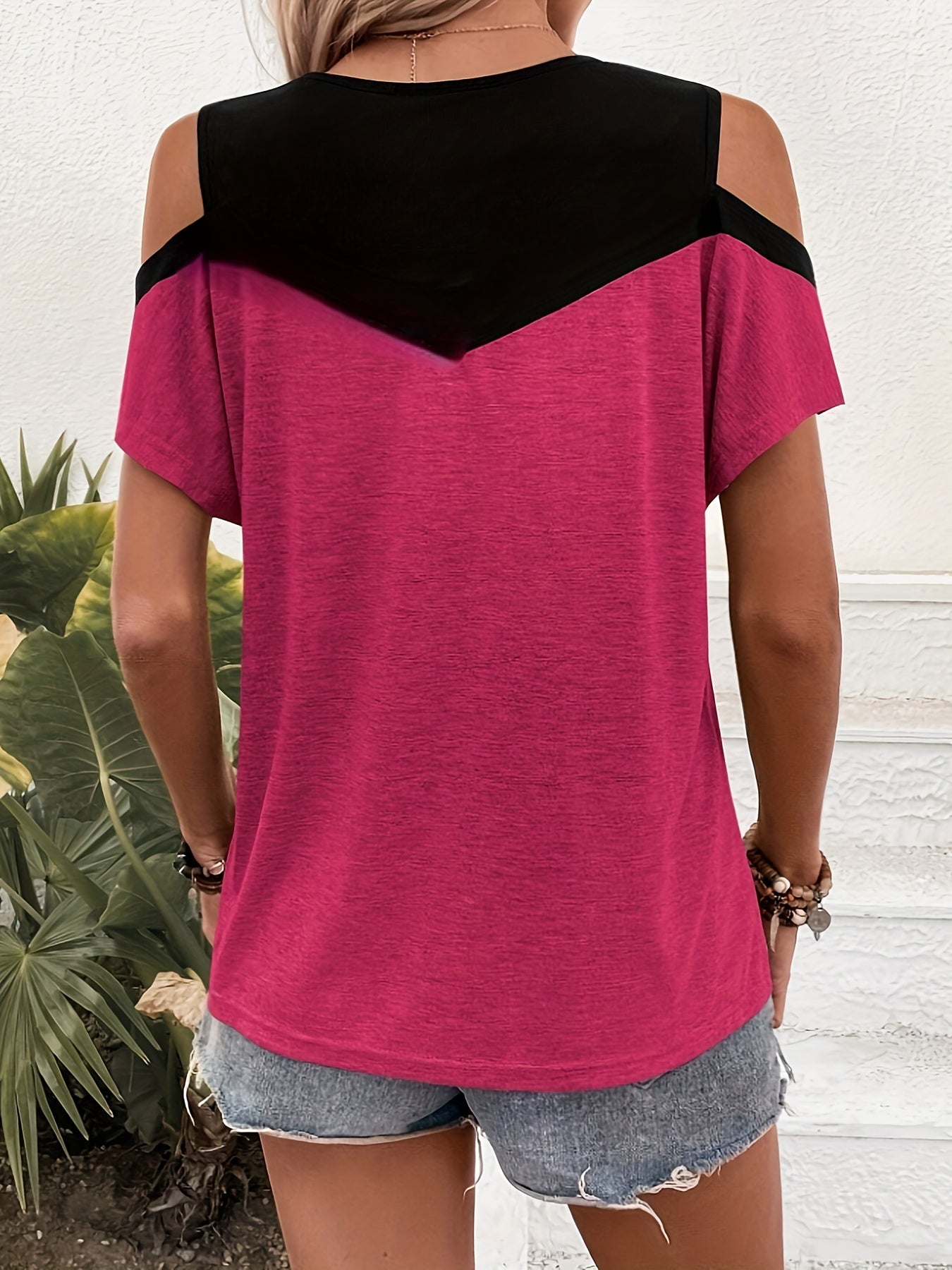 Color Block Cold Shoulder T-Shirt, Casual Short Sleeve T-Shirt
