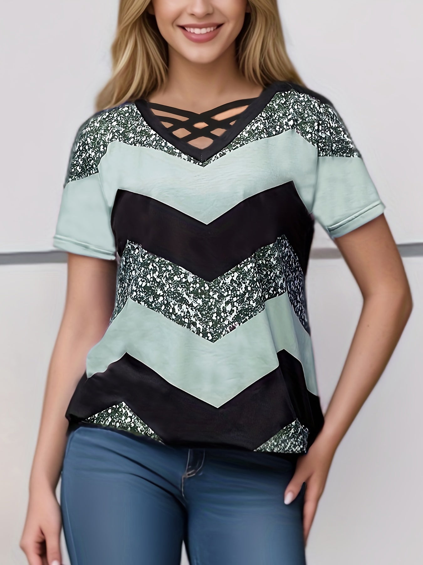 Color Block Crisscross V Neck T-Shirt, Casual Short Sleeve T-Shirt