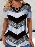 Sale Color Block Crisscross V Neck T-Shirt, Casual Short Sleeve T-Shirt