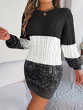 Sale Color Block Long Sleeve Dress, Crew Neck Cable Knit Slim Dress