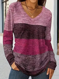 Color Block V Neck T-Shirt, Casual Long Sleeve Top