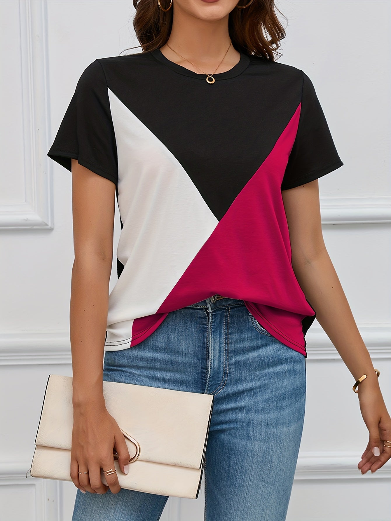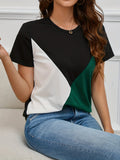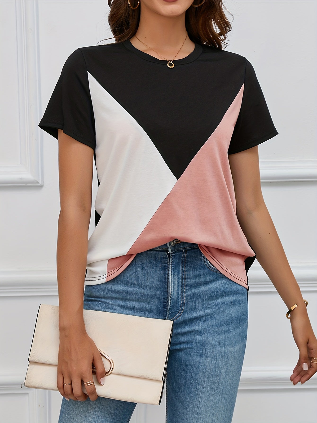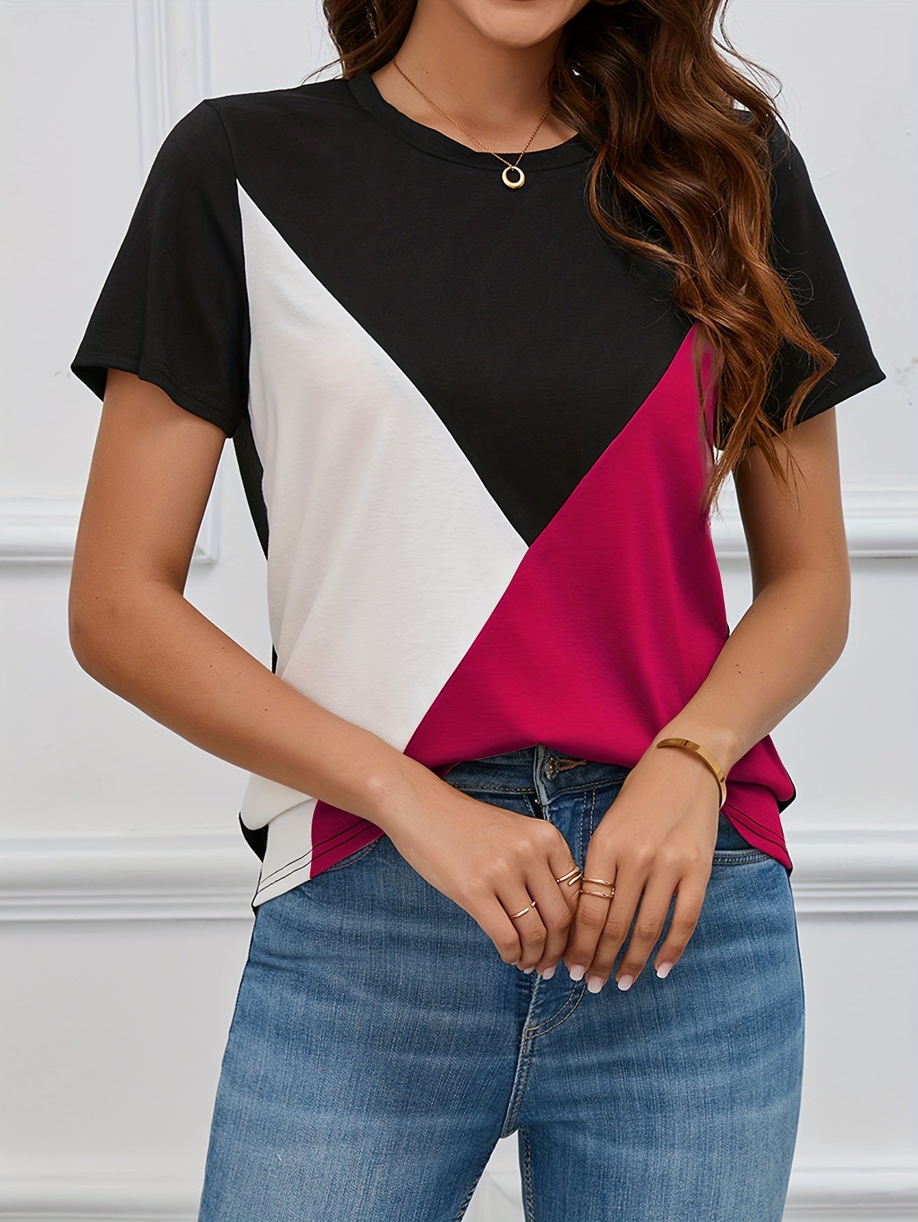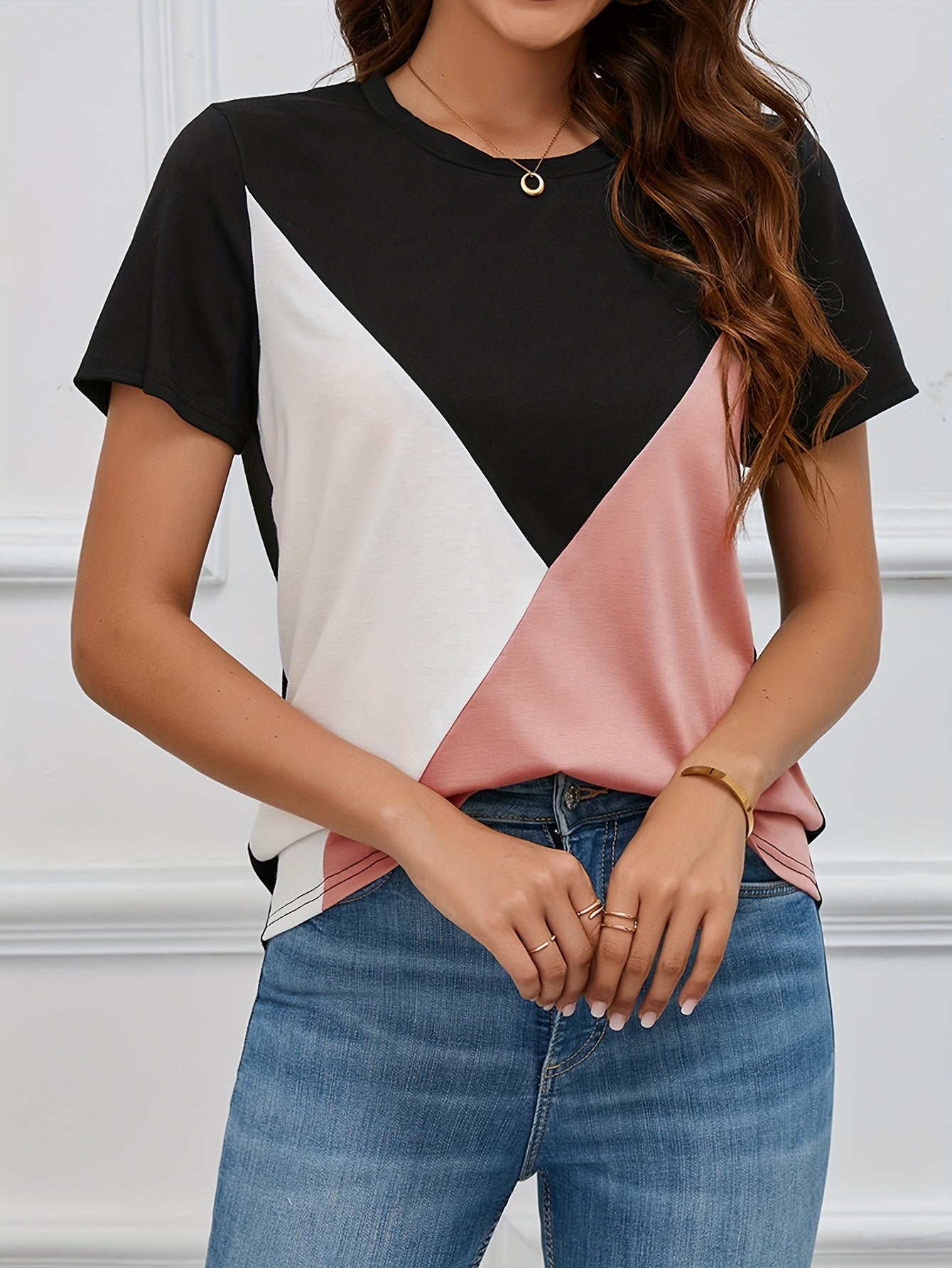 Colorblock Print T-shirt, Casual Short Sleeve Crew Neck T-shirt