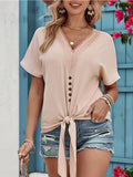 Sale Contrast Lace V Neck Blouse, Elegant Lace Up Short Sleeve Button Front Blouse