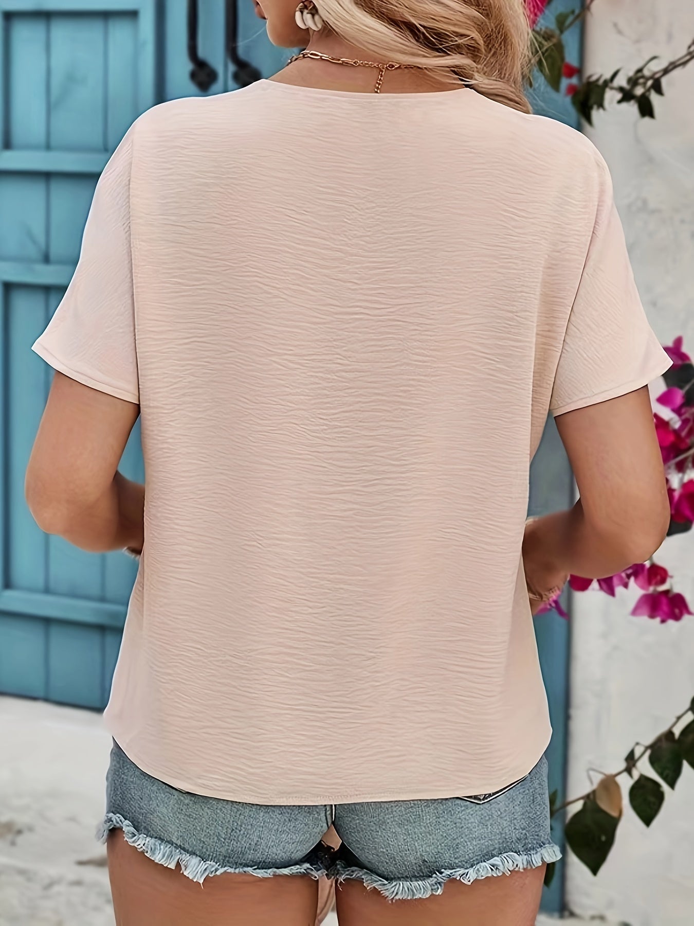 Sale Solid Pleated Trim Blouse, Casual Crew Neck Short Sleeve Blouse