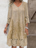 Contrast Lace V Neck Dress, Casual Button Front Three-quarter Sleeve Dress
