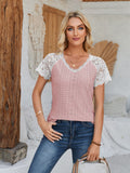 Contrast Lace V-Neck T-Shirt, Elegant Eyelet Short Sleeve T-Shirt