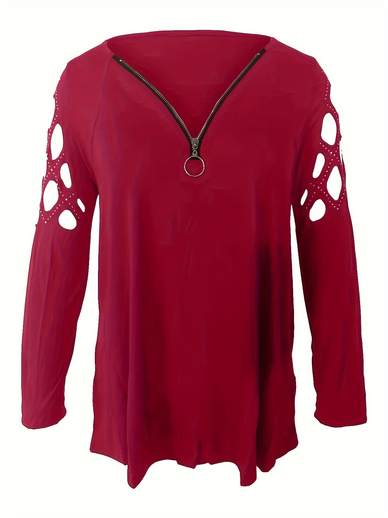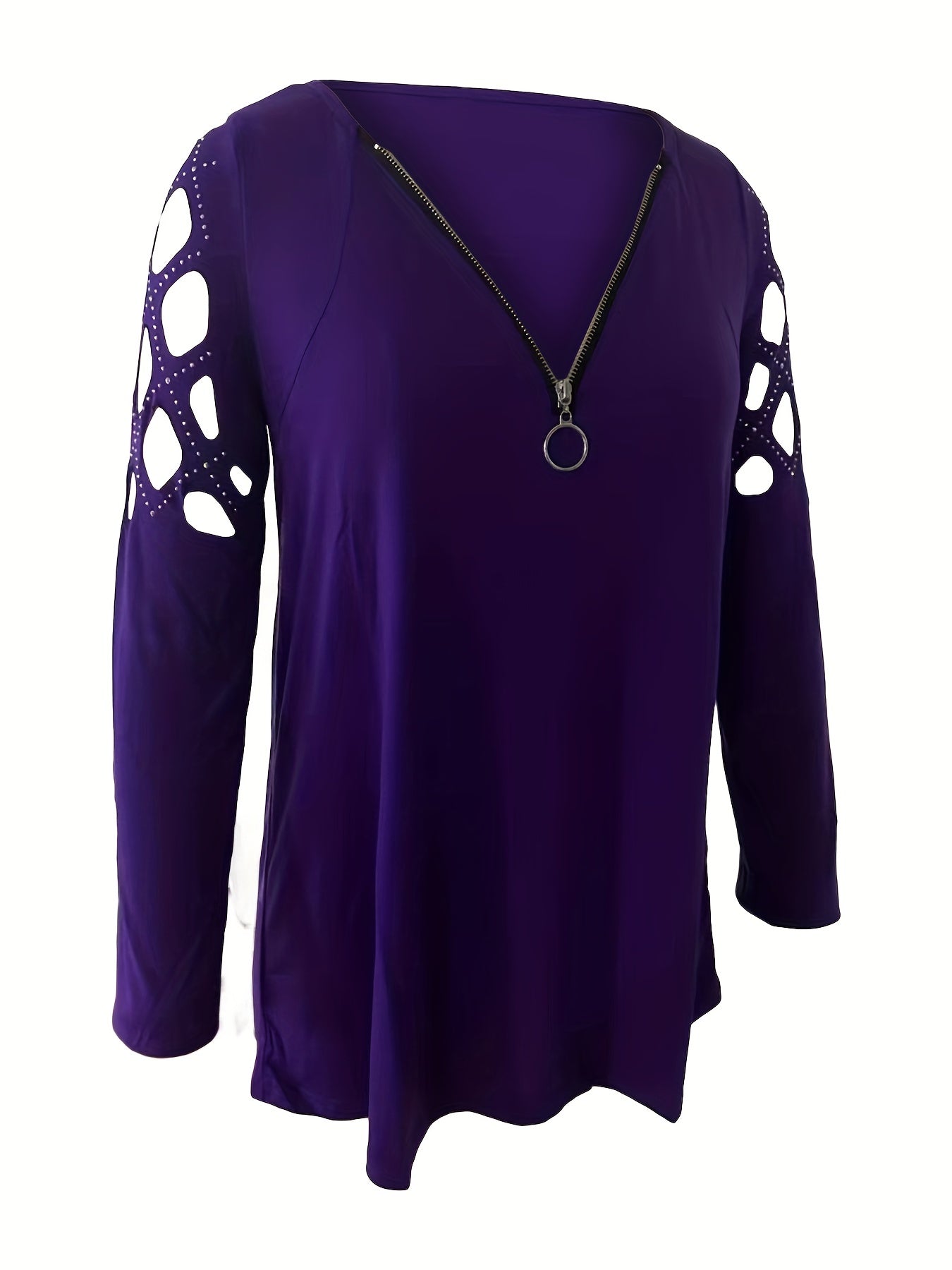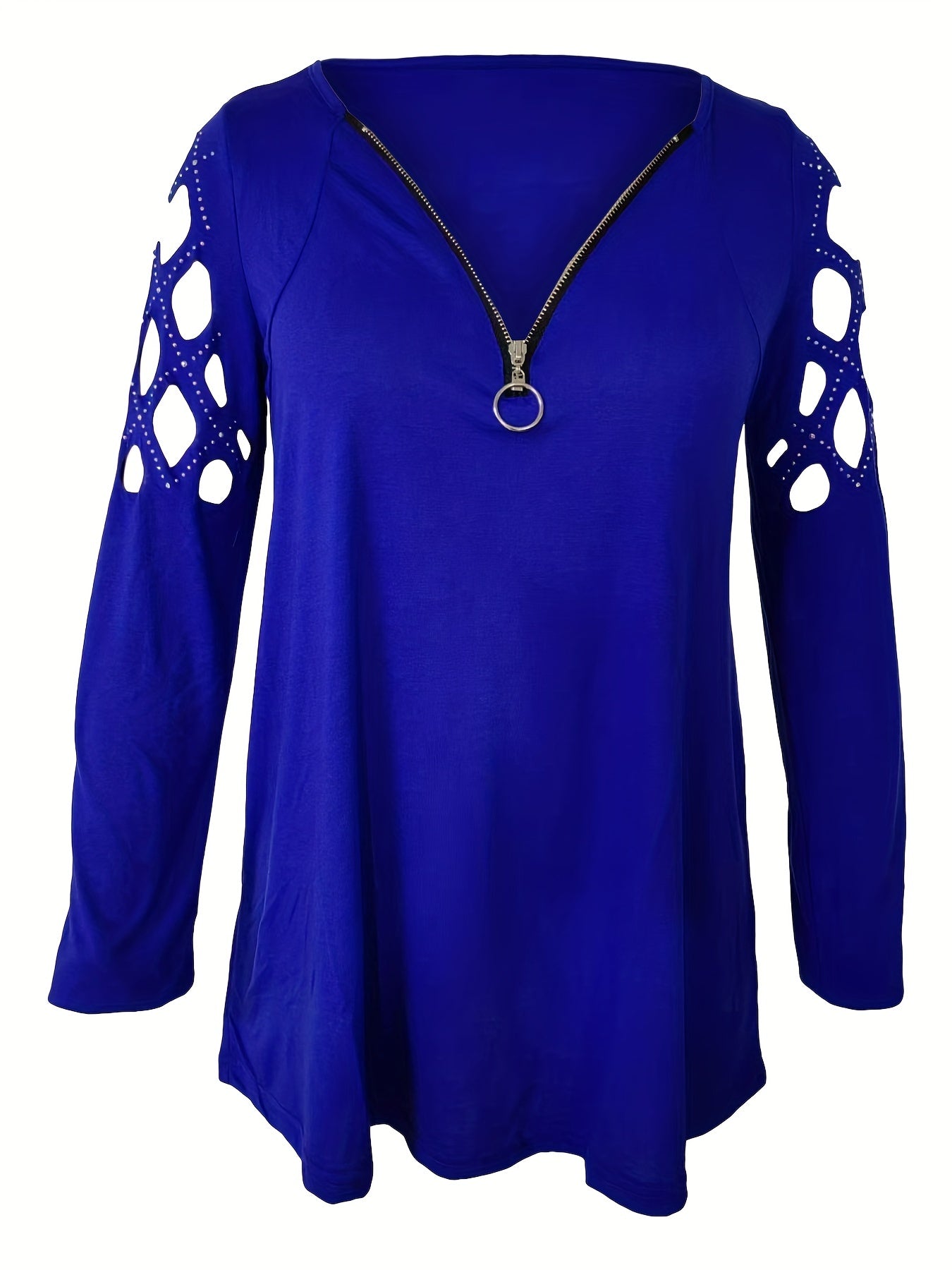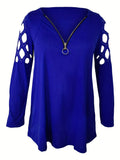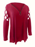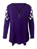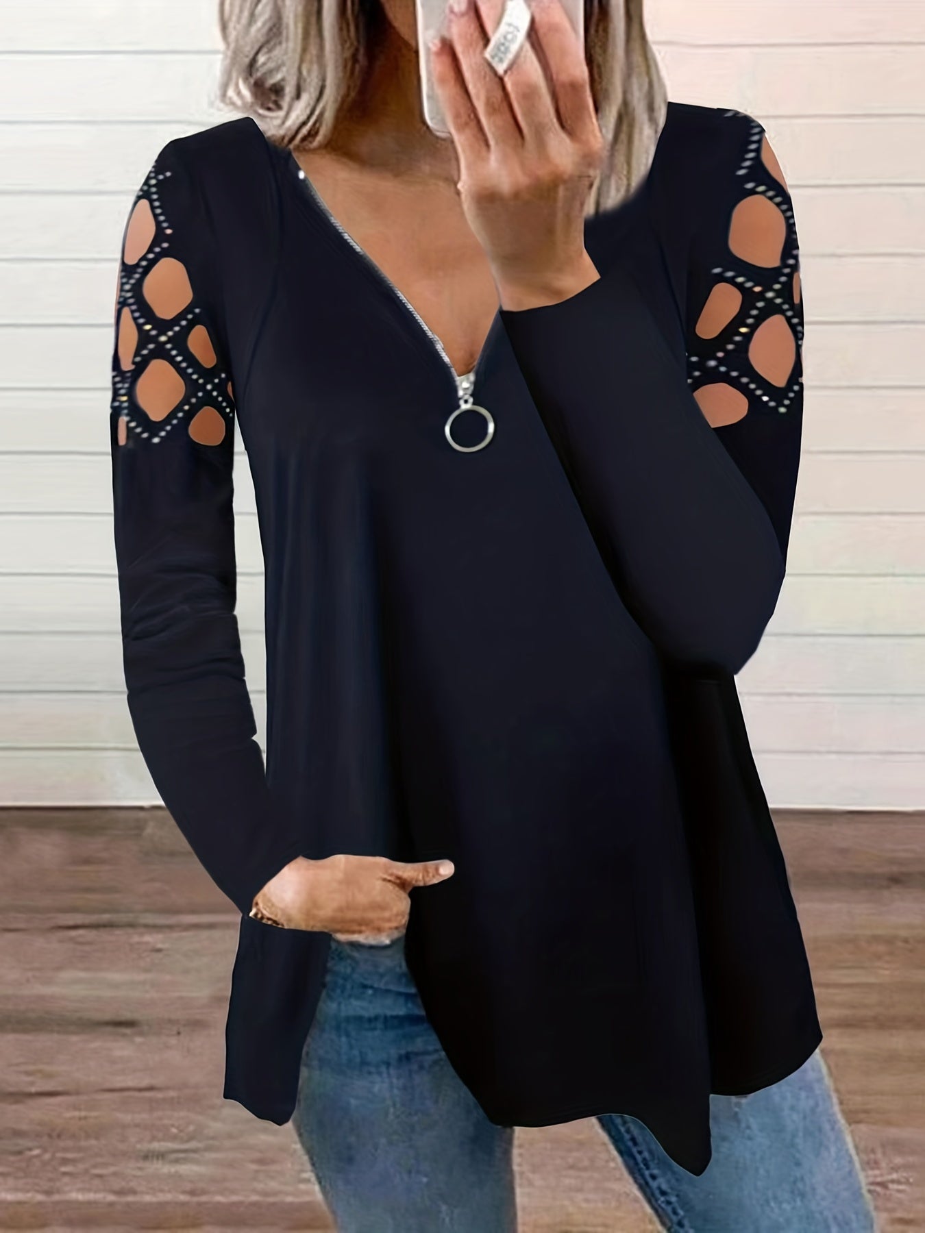 Cutout Zipper Front T-Shirt, Casual V Neck Long Sleeve T-Shirt