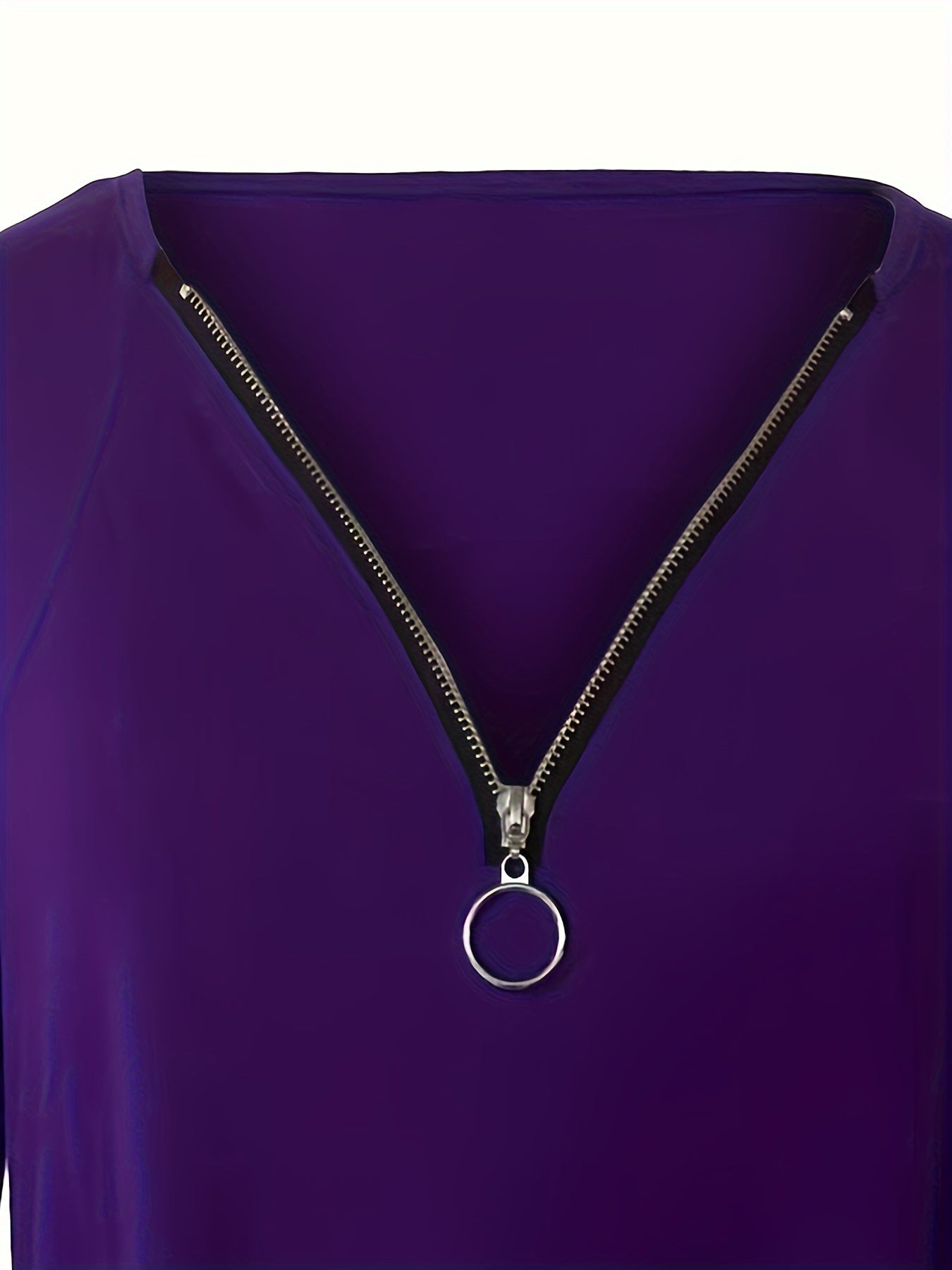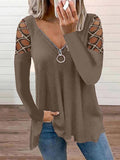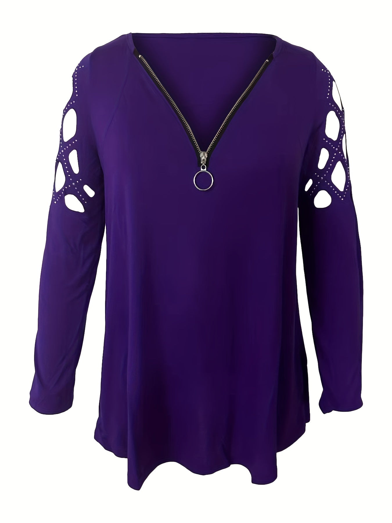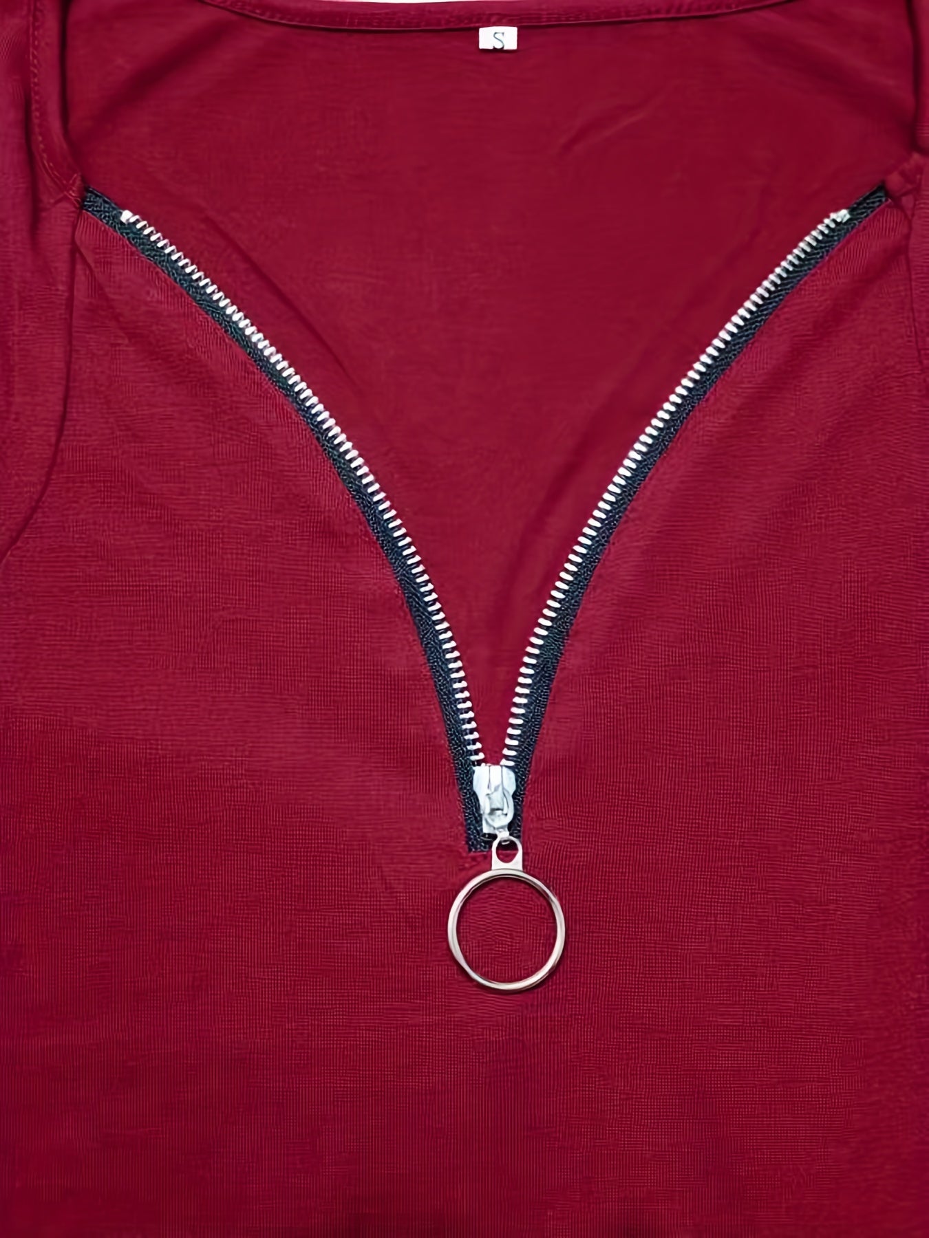 Cutout Zipper Front T-Shirt, Casual V Neck Long Sleeve T-Shirt