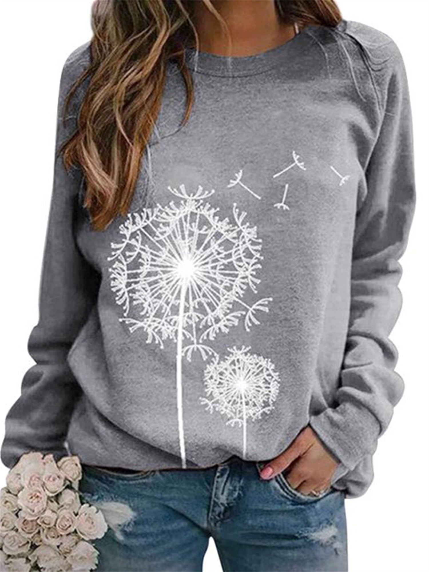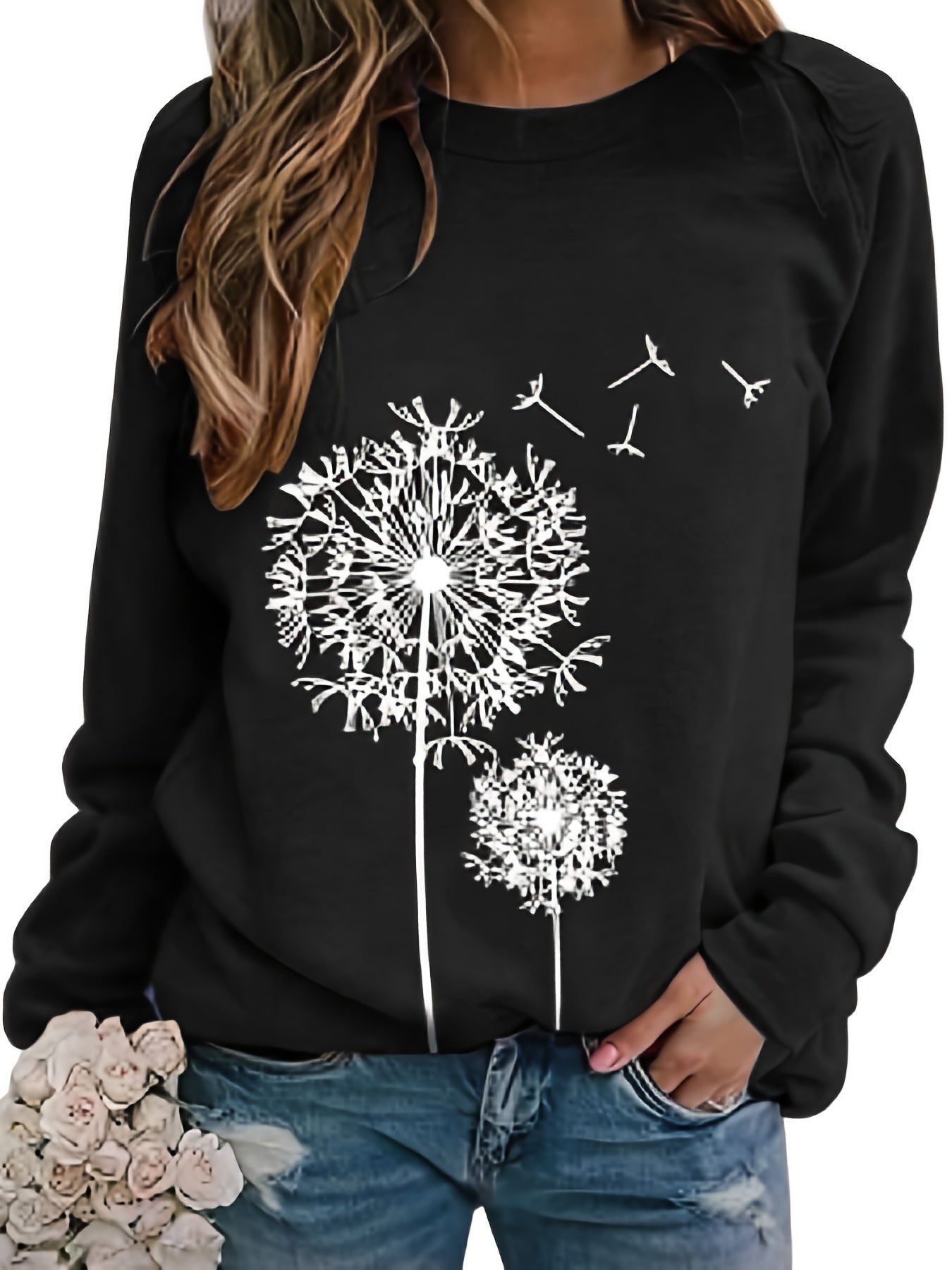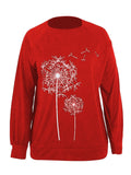 Sale Dandelion Print Crew Neck T-shirt, Casual Loose Long Sleeve T-Shirts Tops
