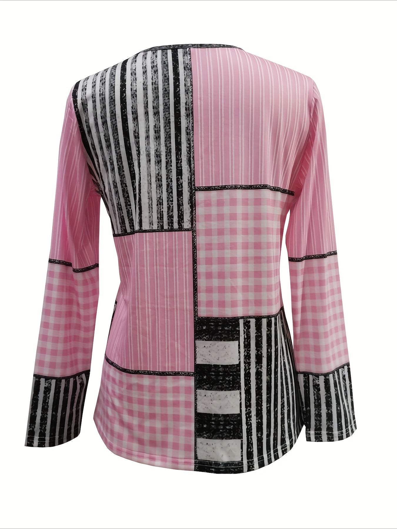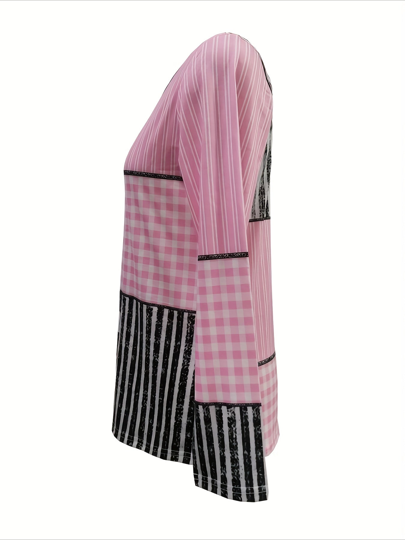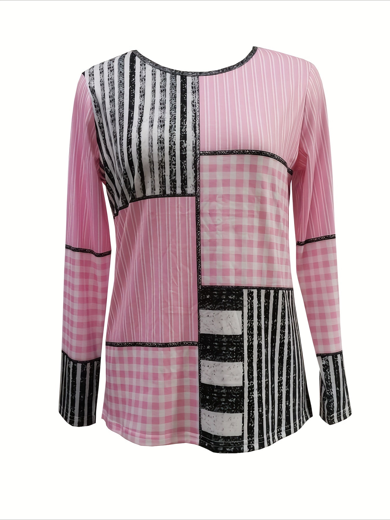 Elegant Color Block Print Crew Neck Long Sleeve T-Shirt