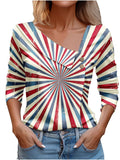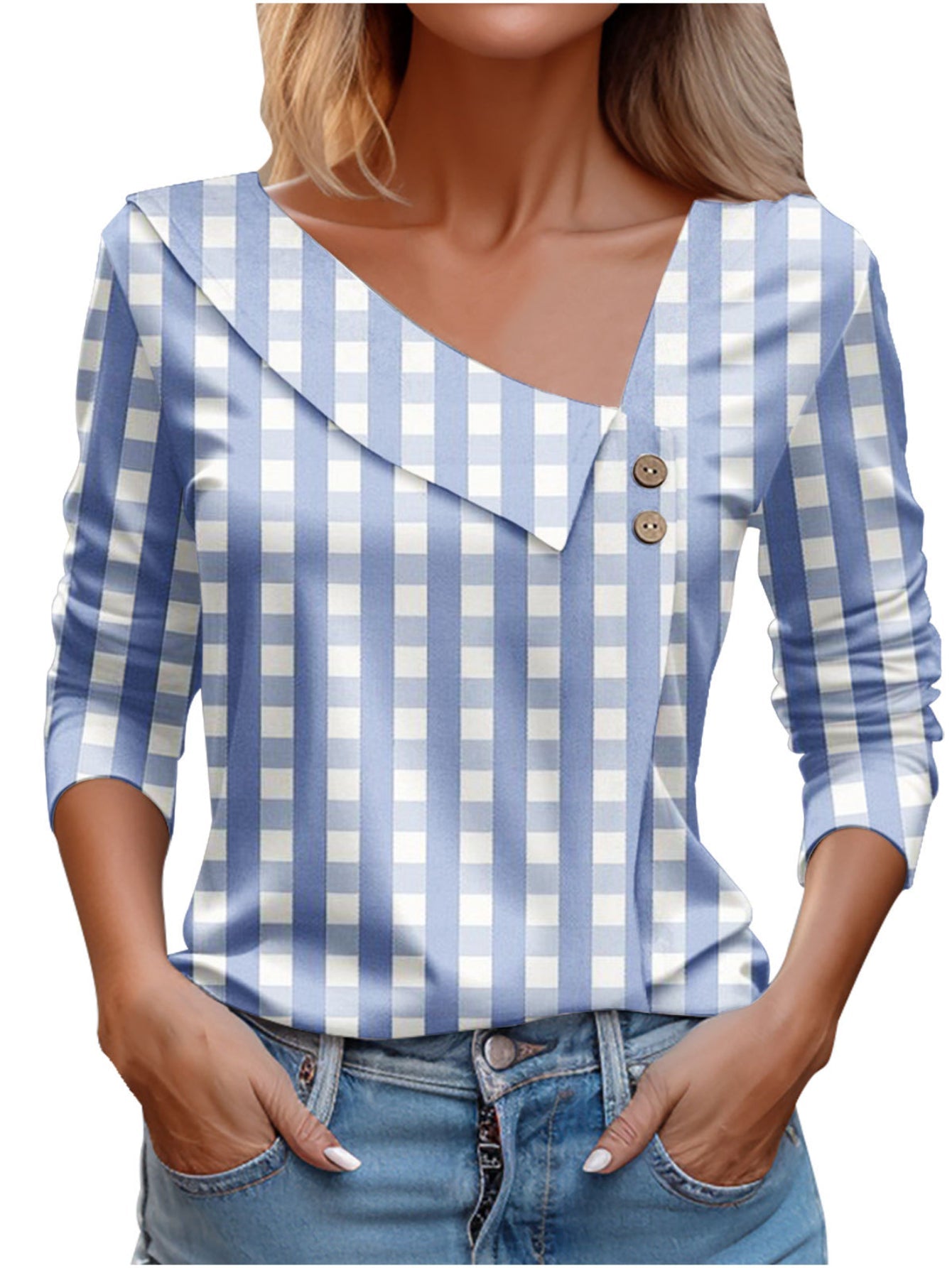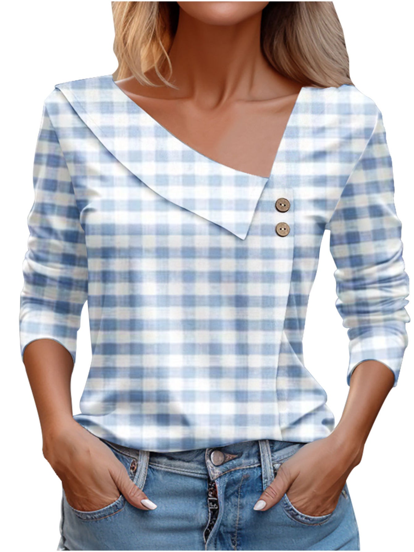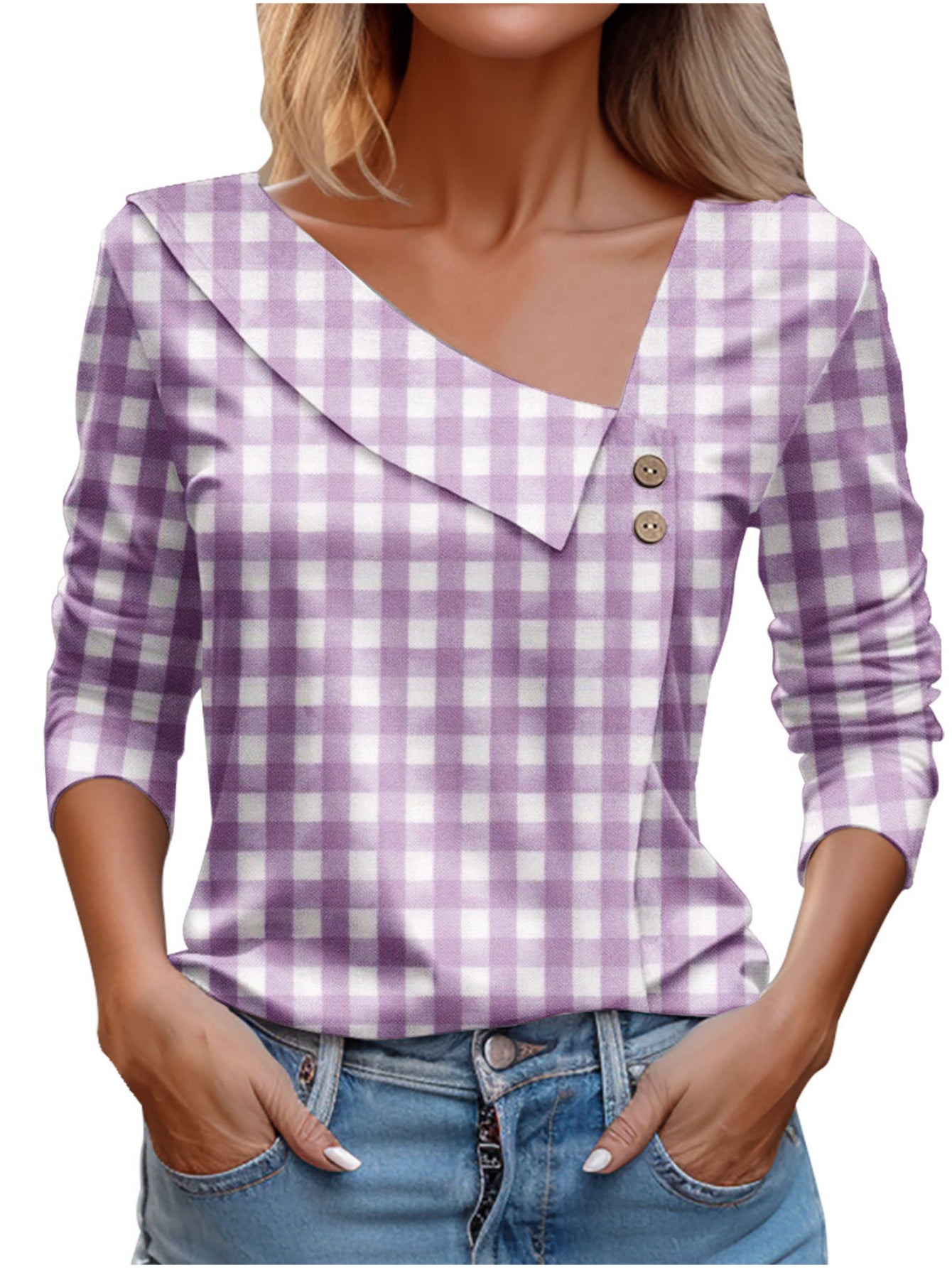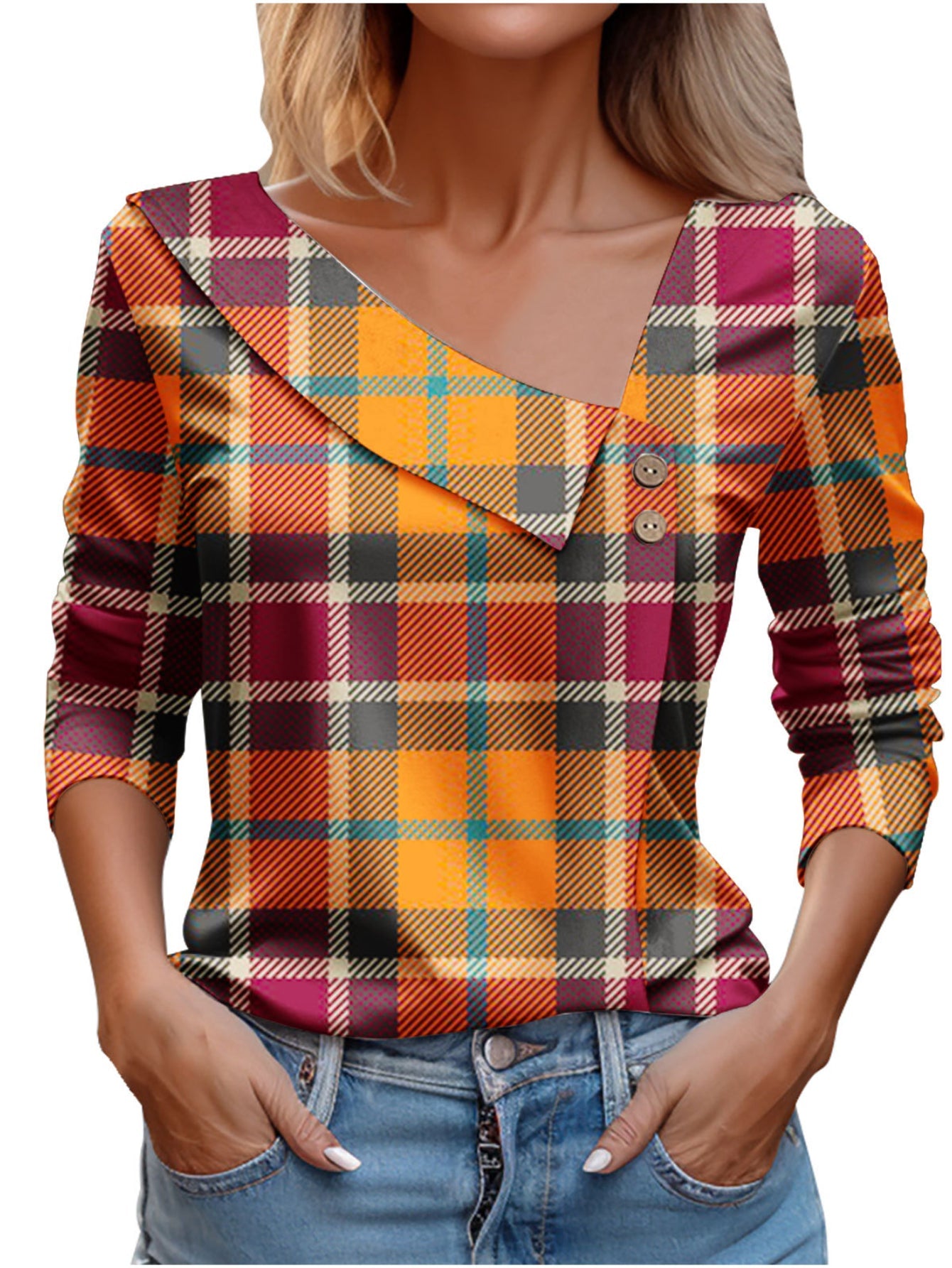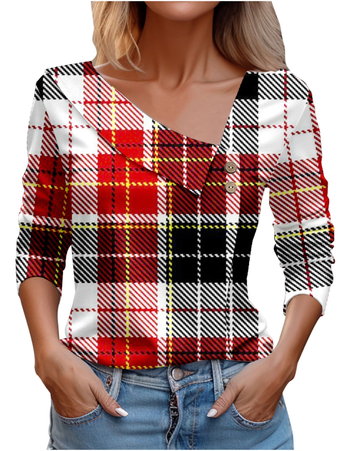 Chic Plaid Print Elegant Long Sleeve V-Neck T-Shirt