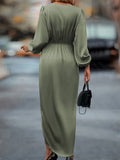 Elegant Ruched Wrap Dress - Cinched Waist, Surplice Neck, Long Sleeve, Comfortable Fit