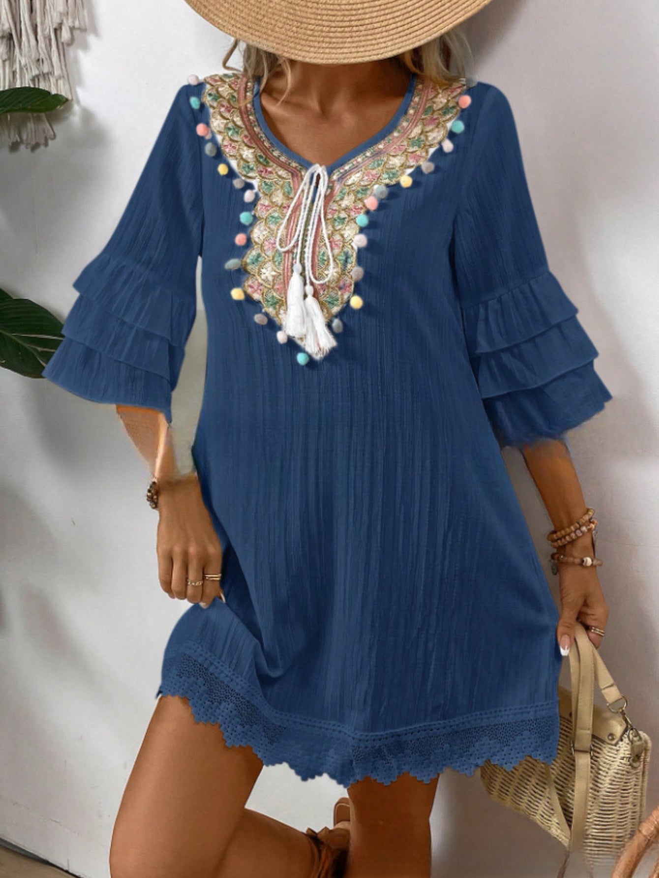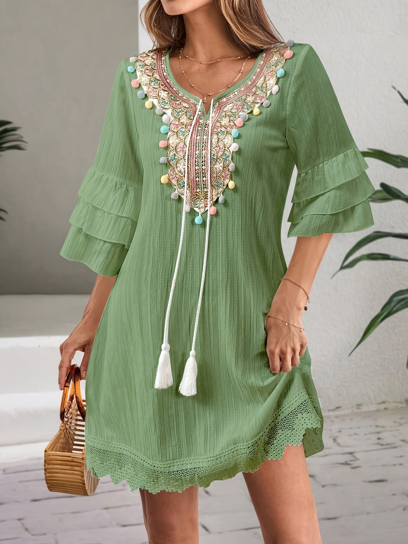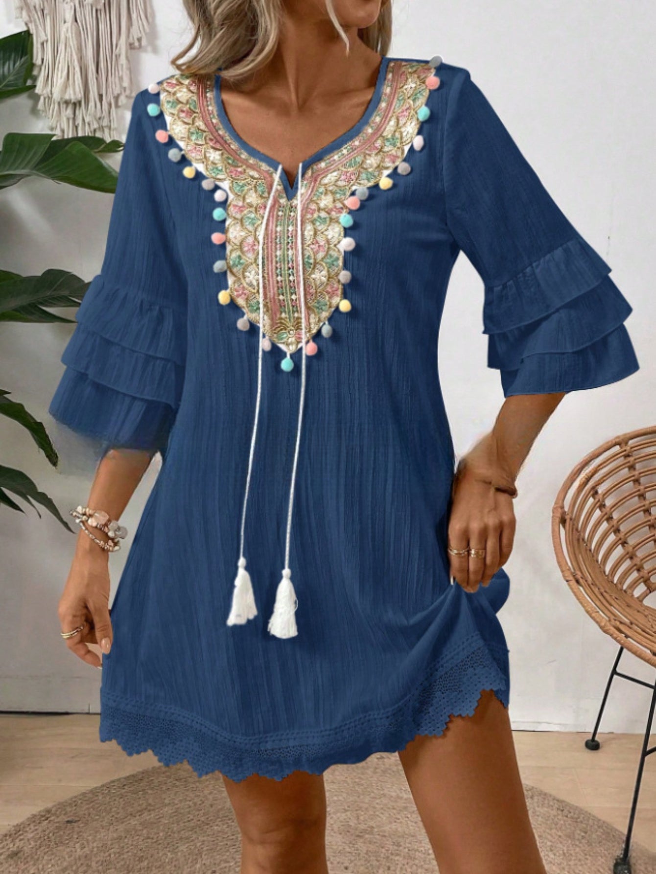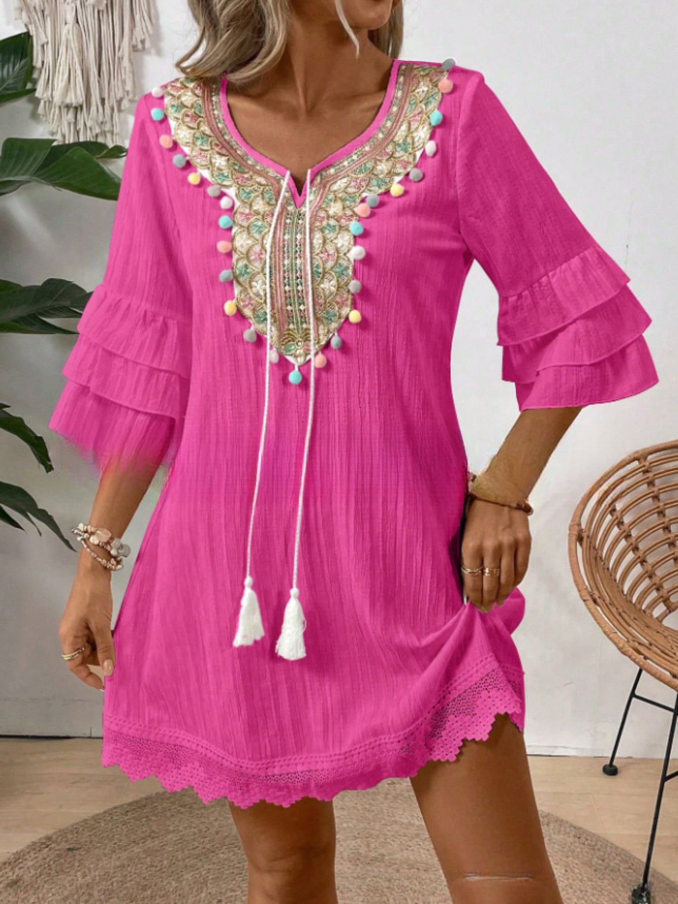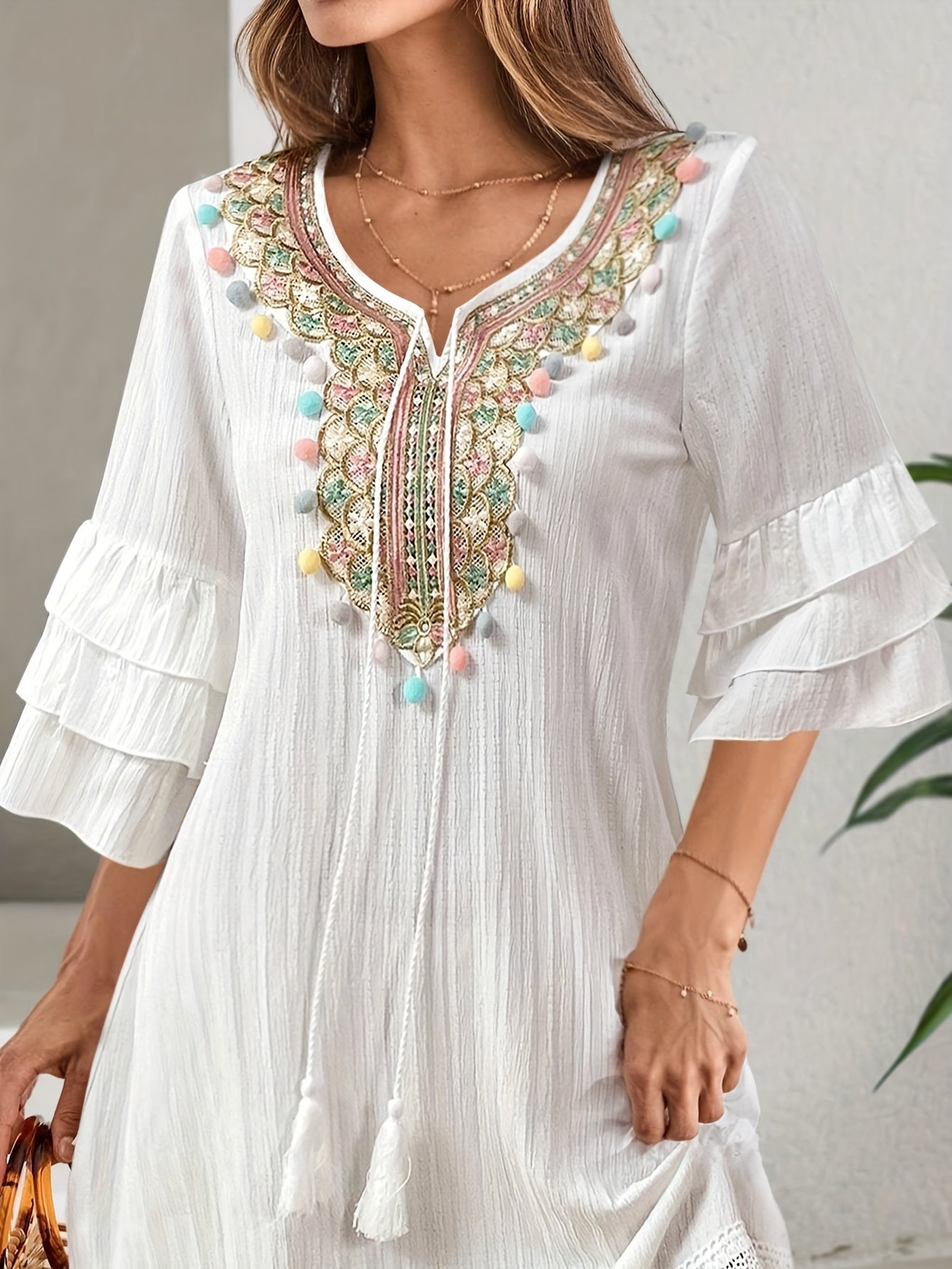 Elegant Women's Notched V-Neck Dress with Colorful Pom-Pom Embellishments, Ruffle Sleeves