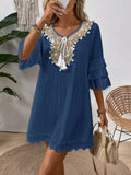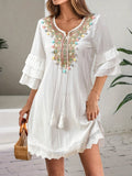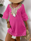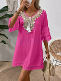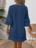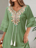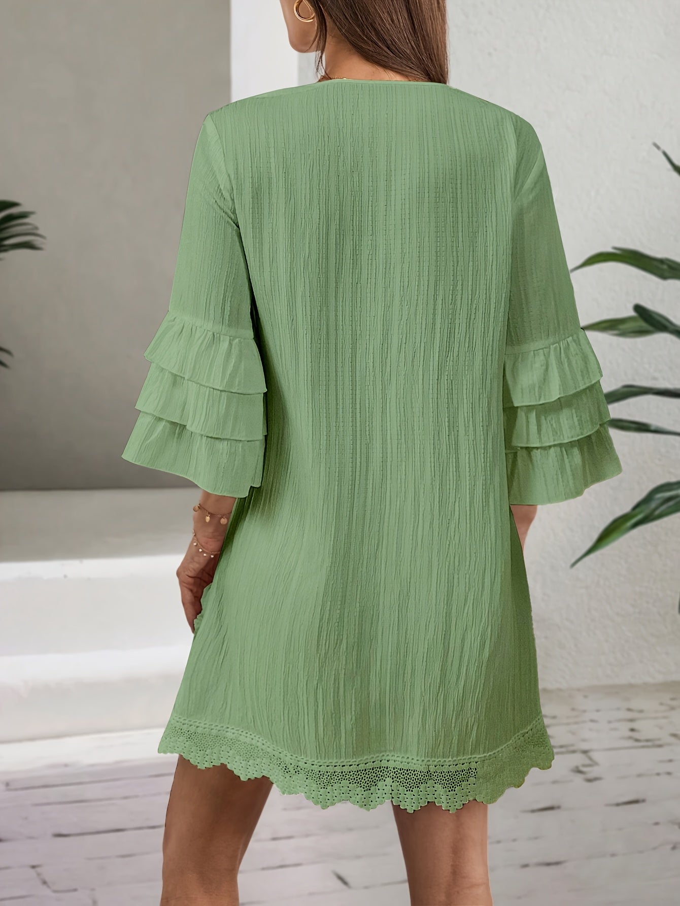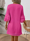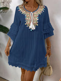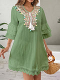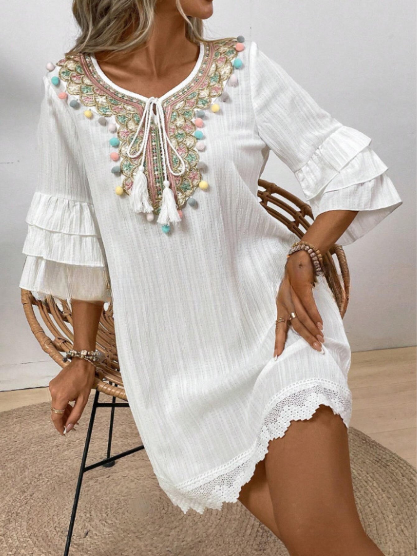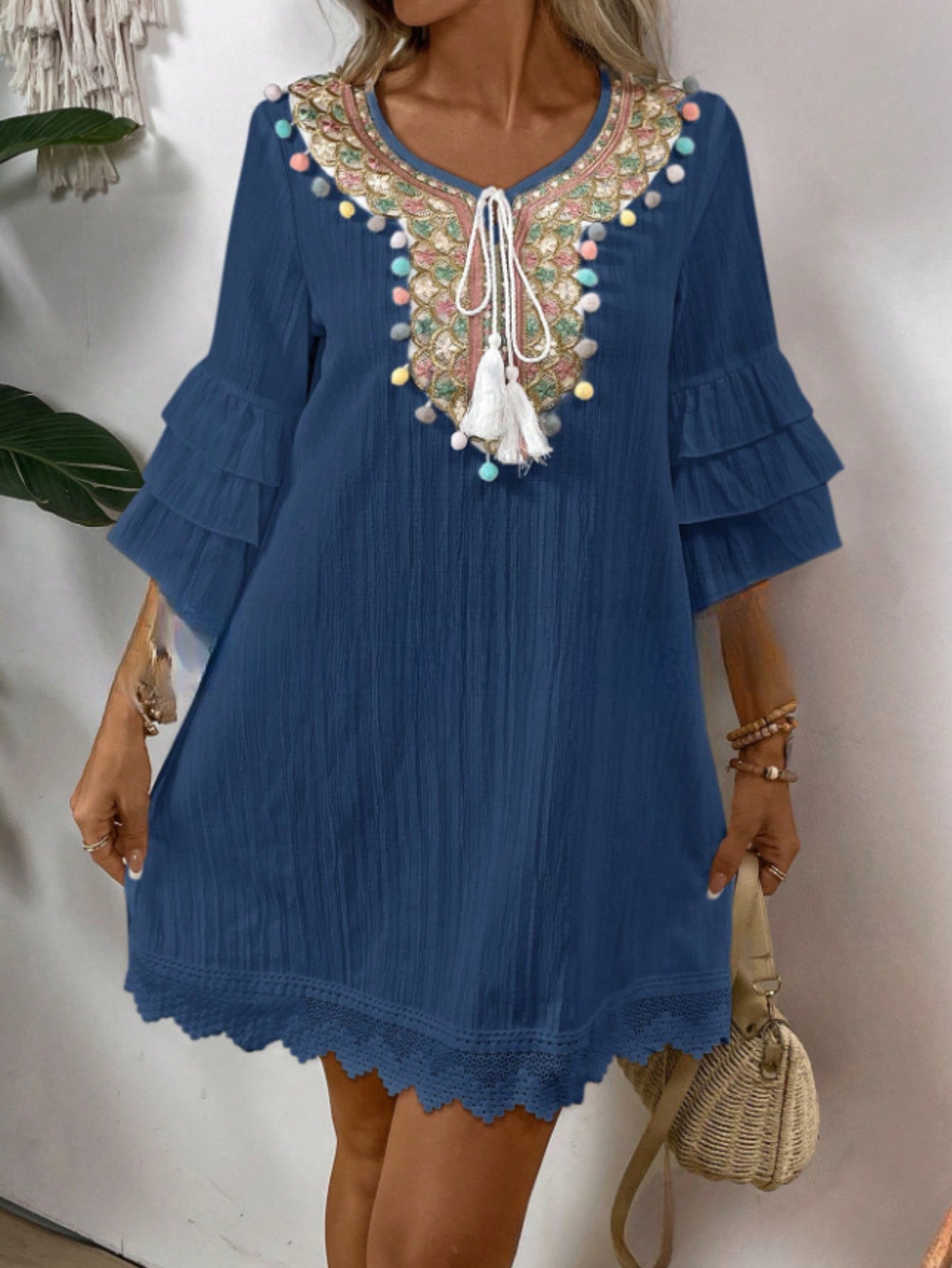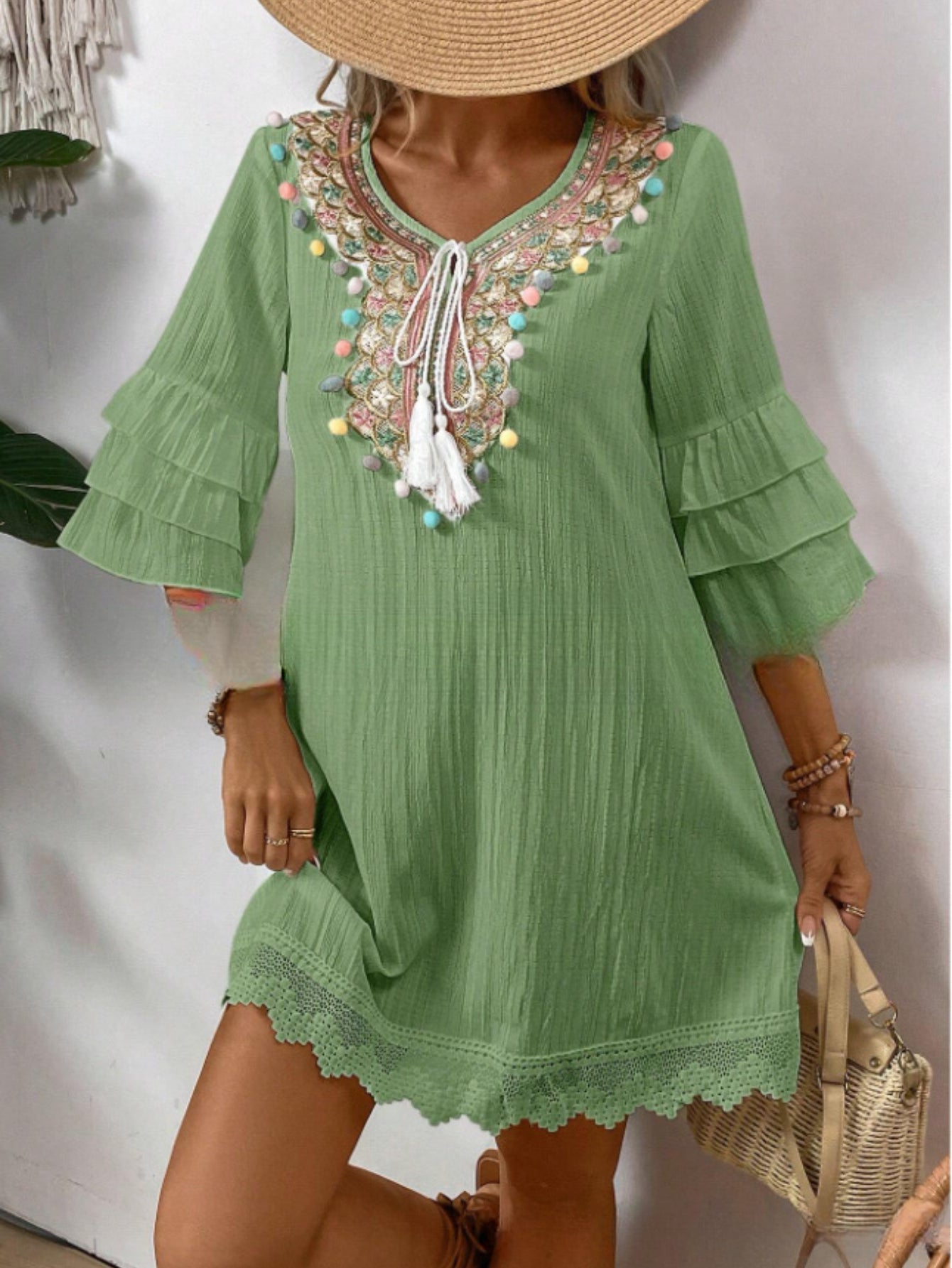 Elegant Women's Notched V-Neck Dress with Colorful Pom-Pom Embellishments, Ruffle Sleeves