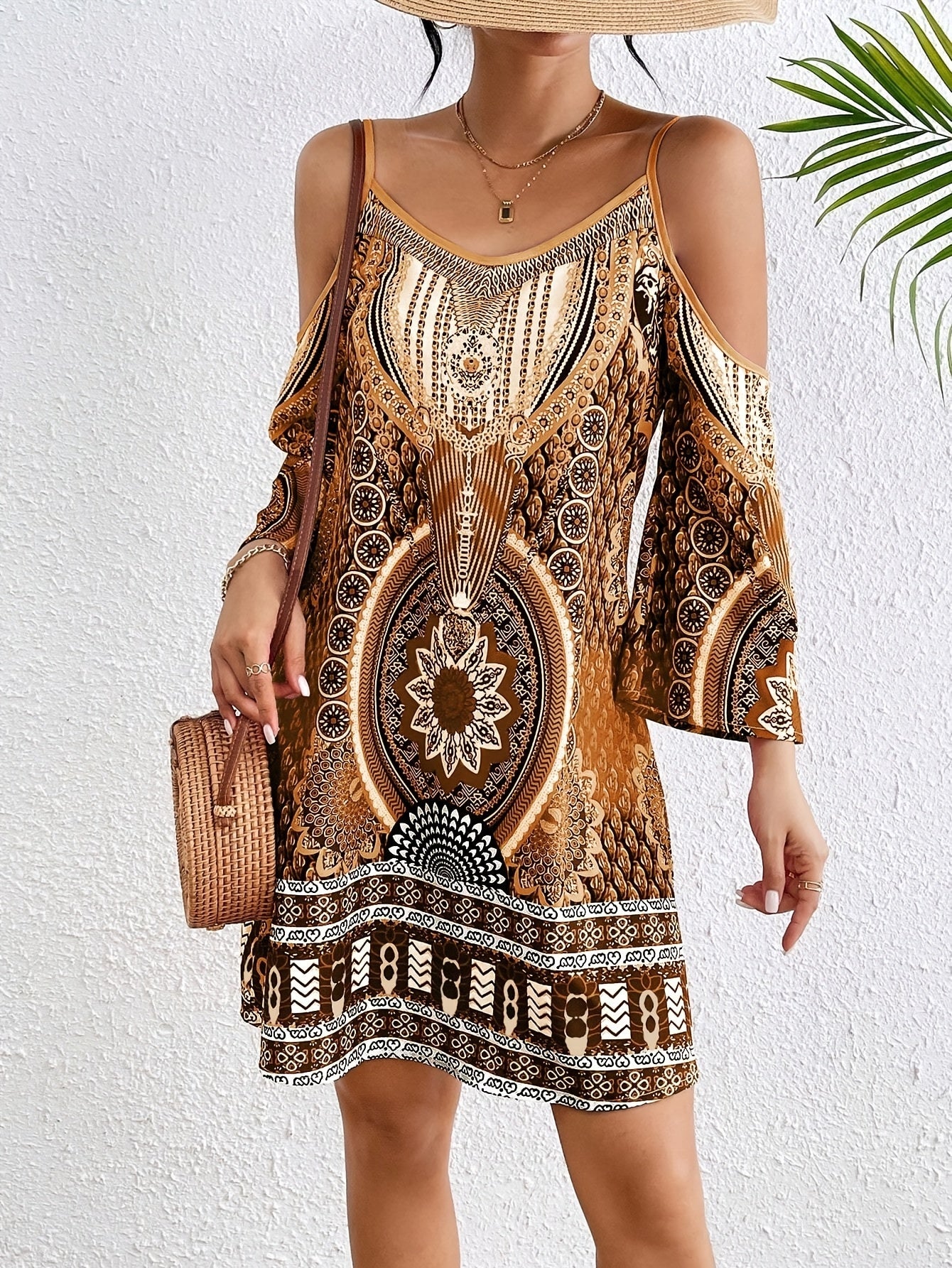 Ethnic Totem Geometric Print Off-Shoulder Long Sleeve Dress