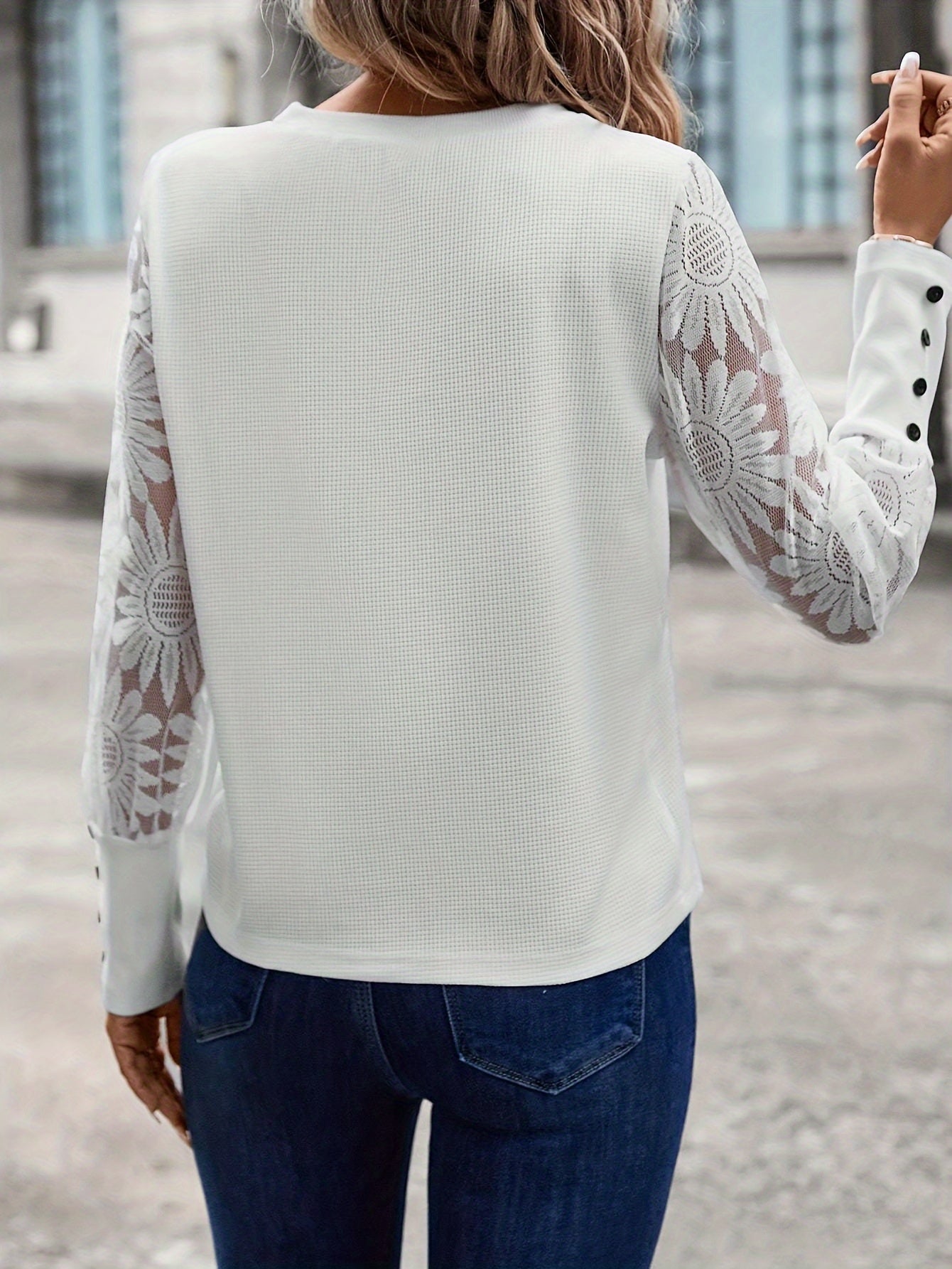 Floral Lace Splicing Elegant T-Shirt, Crew Neck Long Sleeve T-Shirt