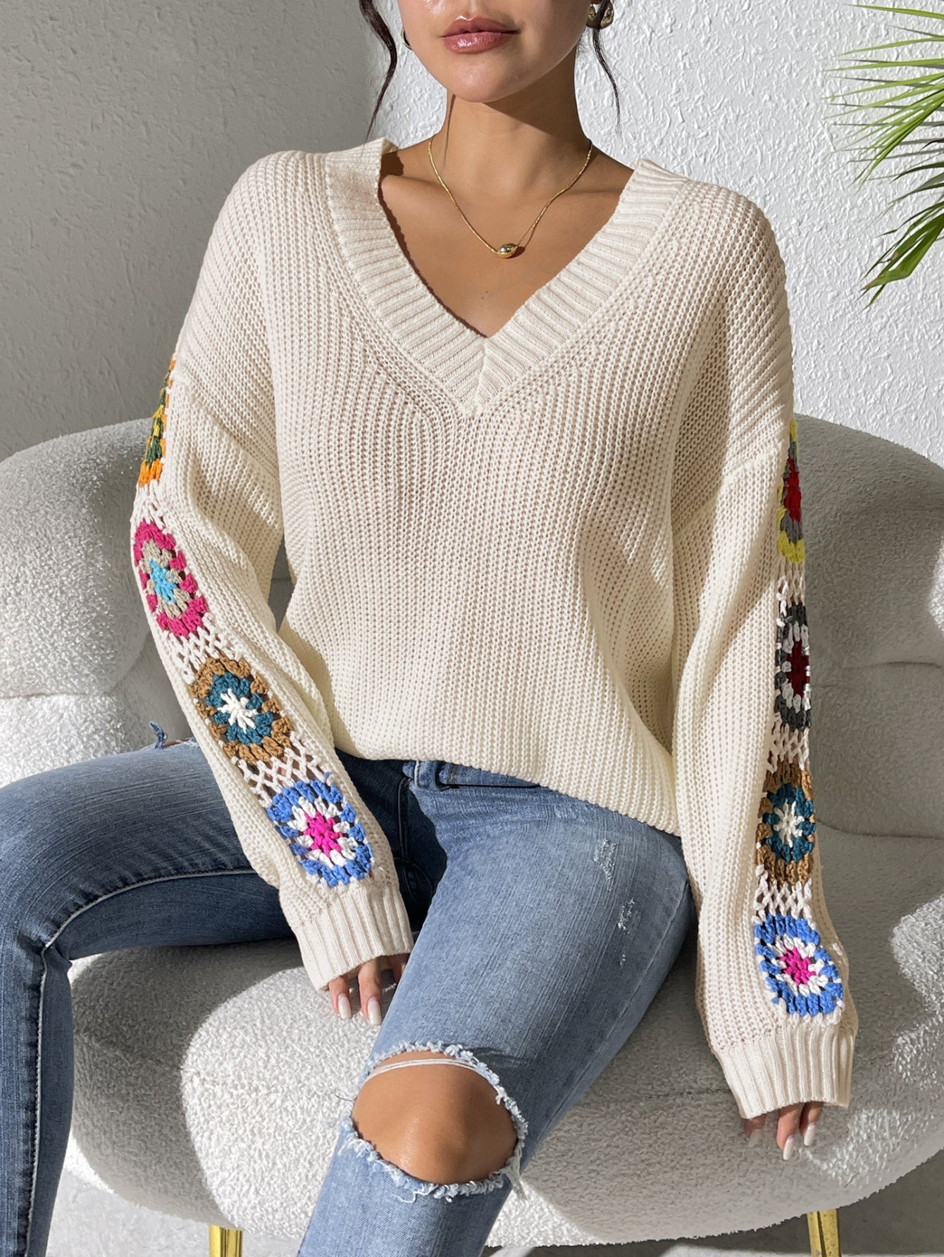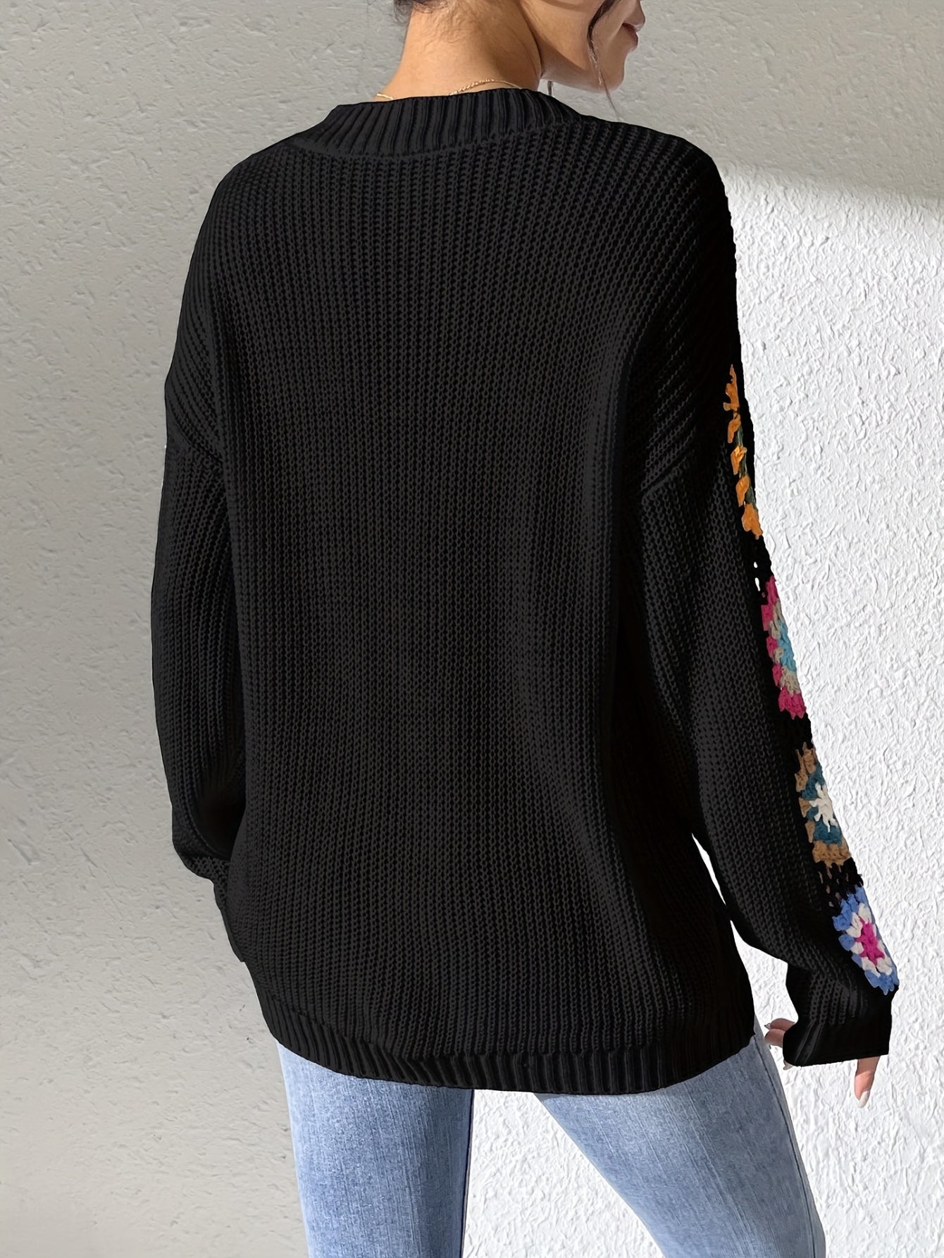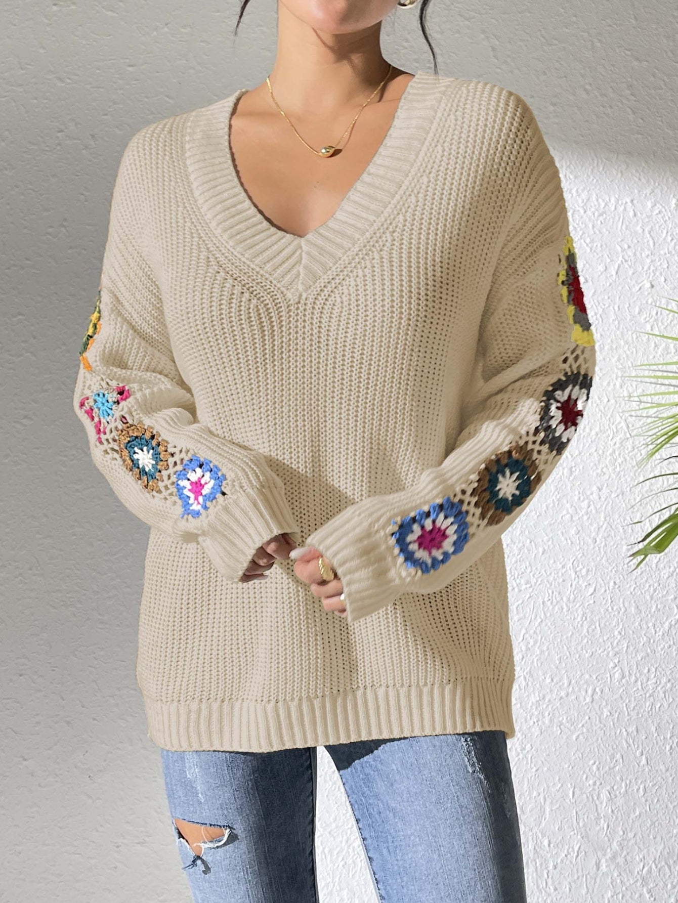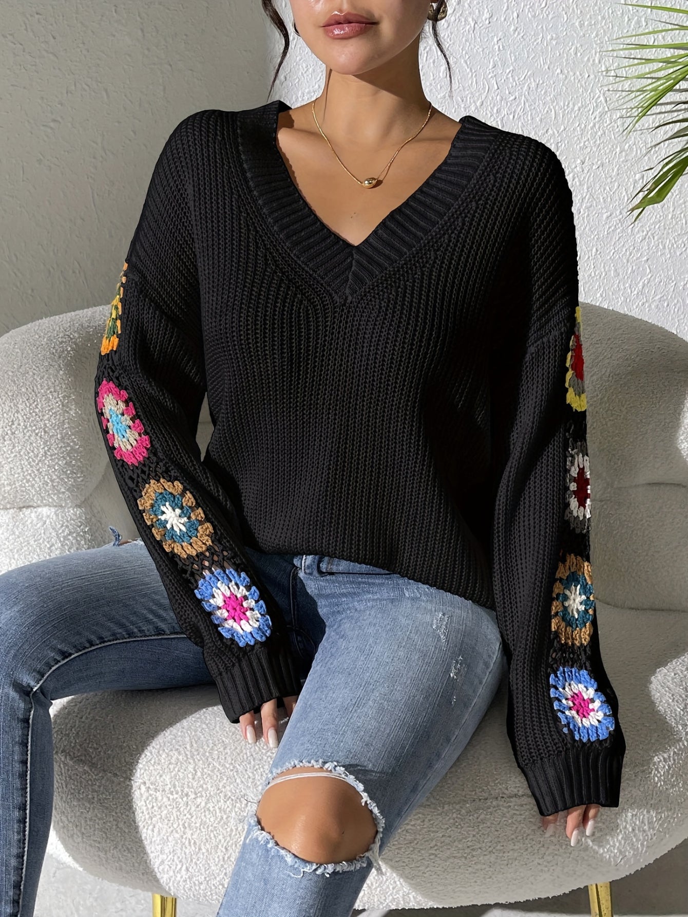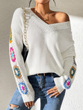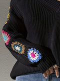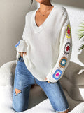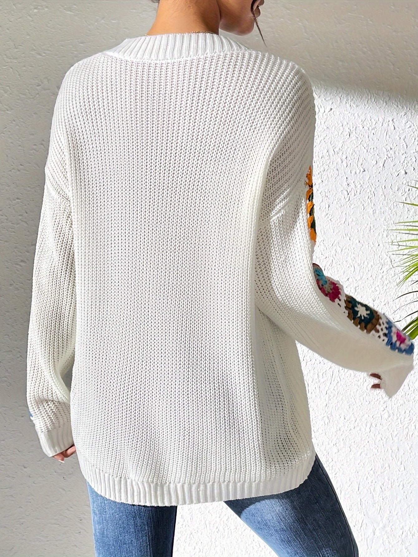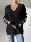 Sale Floral Pattern Drop Shoulder Sweater, Elegant V Neck Long Sleeve Sweater
