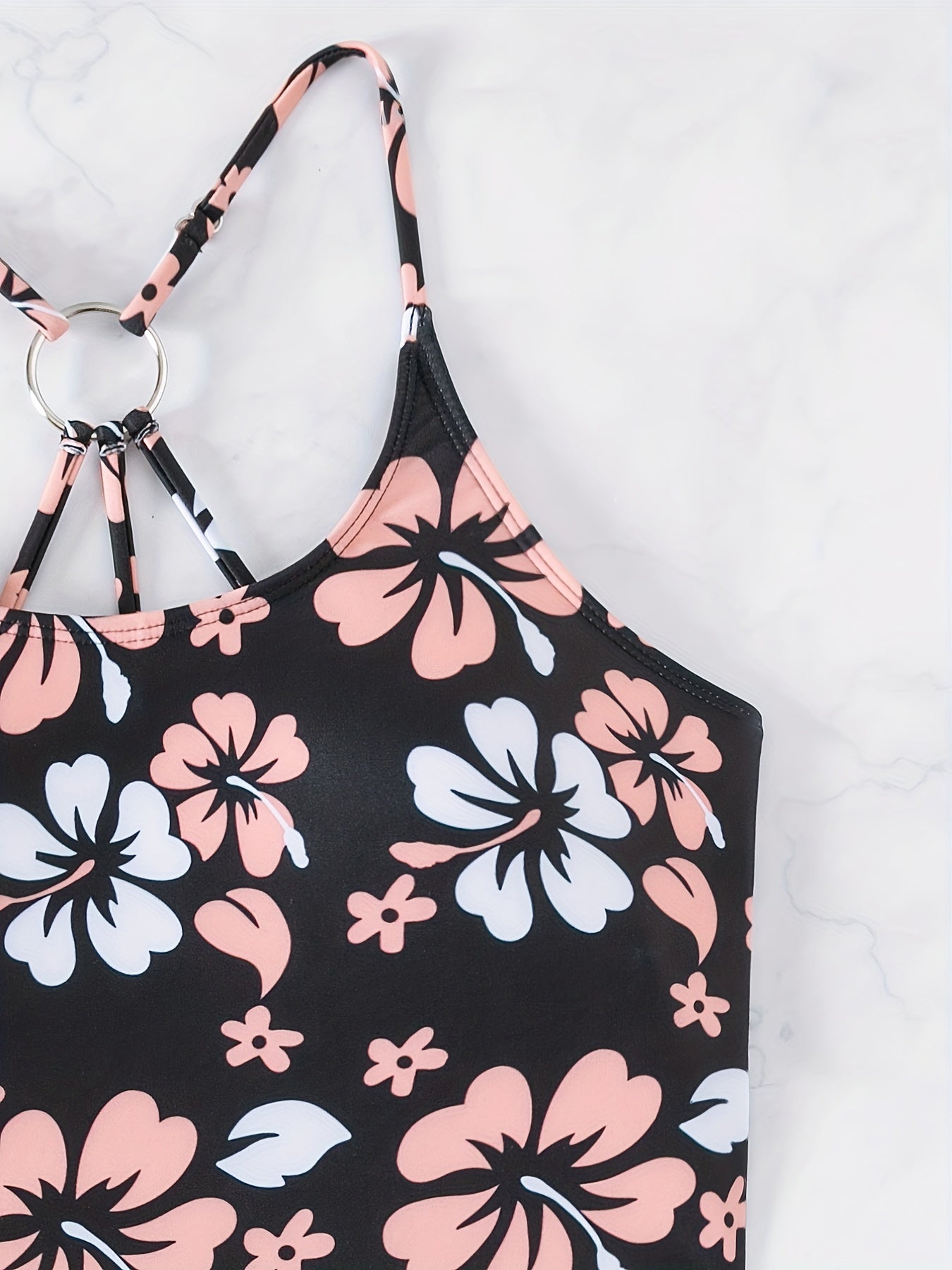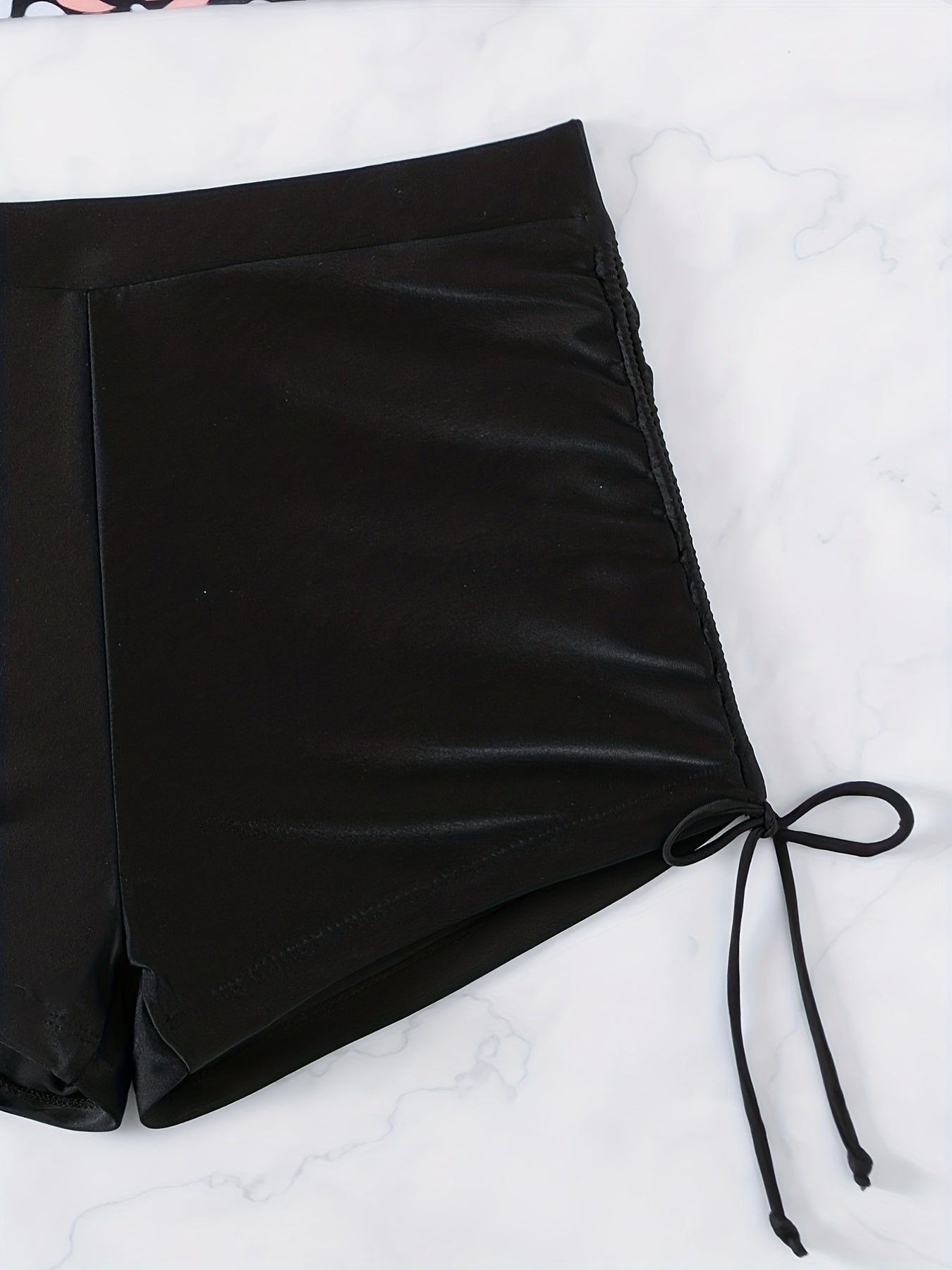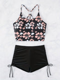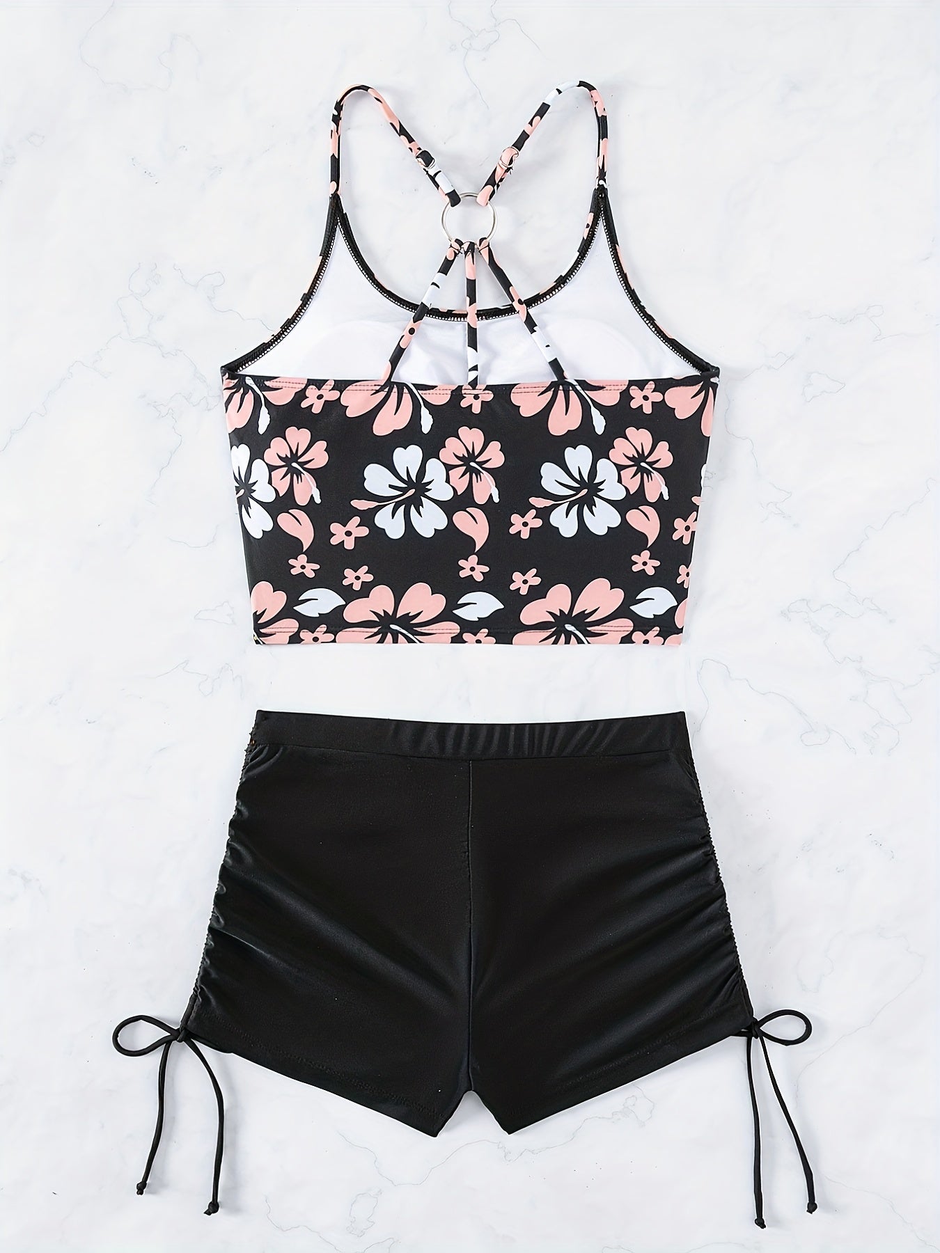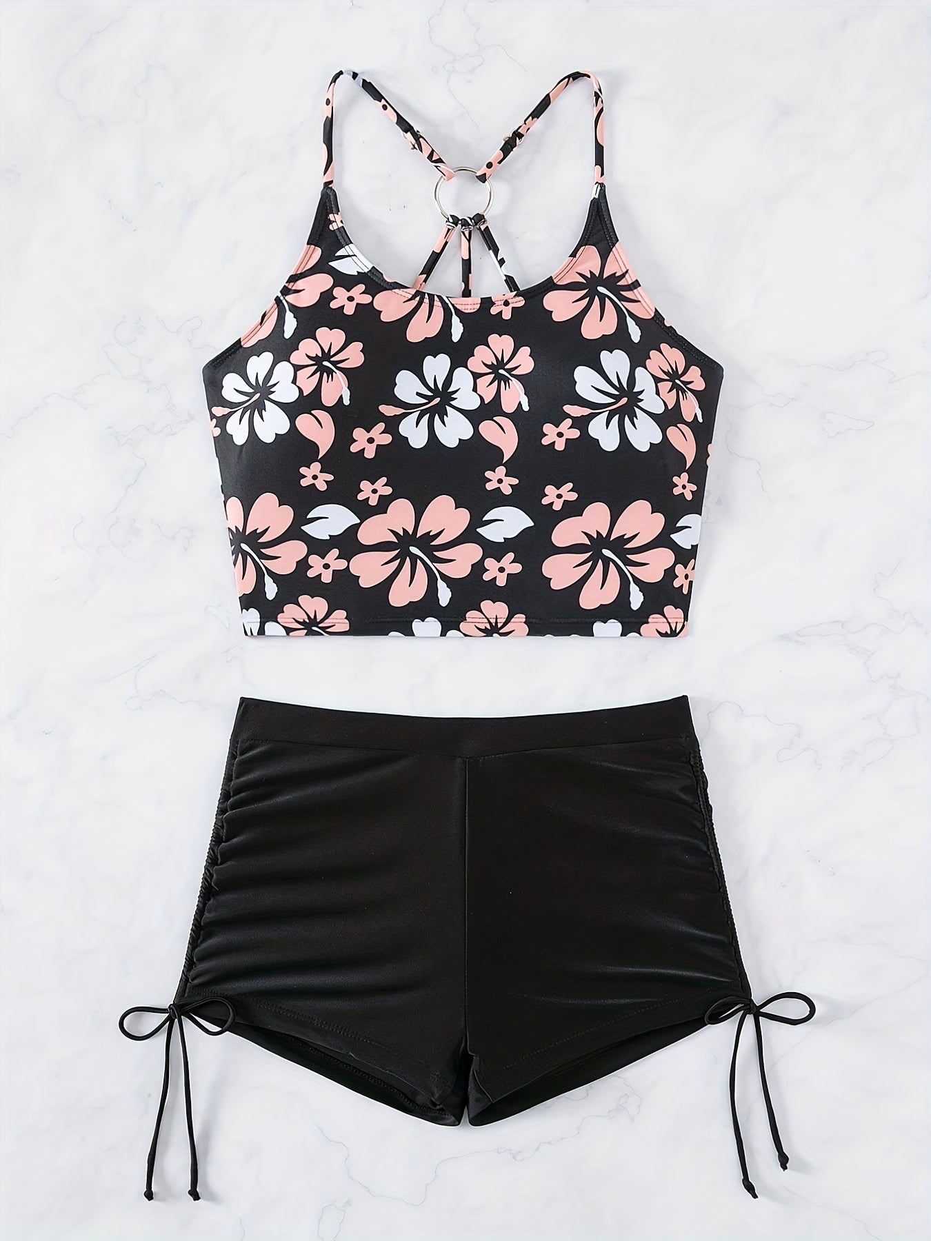 Floral Print Drawstring Ring 2 Piece Set Tankini, Strappy High Waist Stretchy Boxer Shorts Swimsuits
