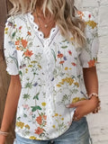 Sale Floral Print Lace Trim Blouse, Vacation Striped V Neck Short Sleeve Blouse