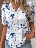 Floral Print Lace Trim Blouse, Vacation Striped V Neck Short Sleeve Blouse