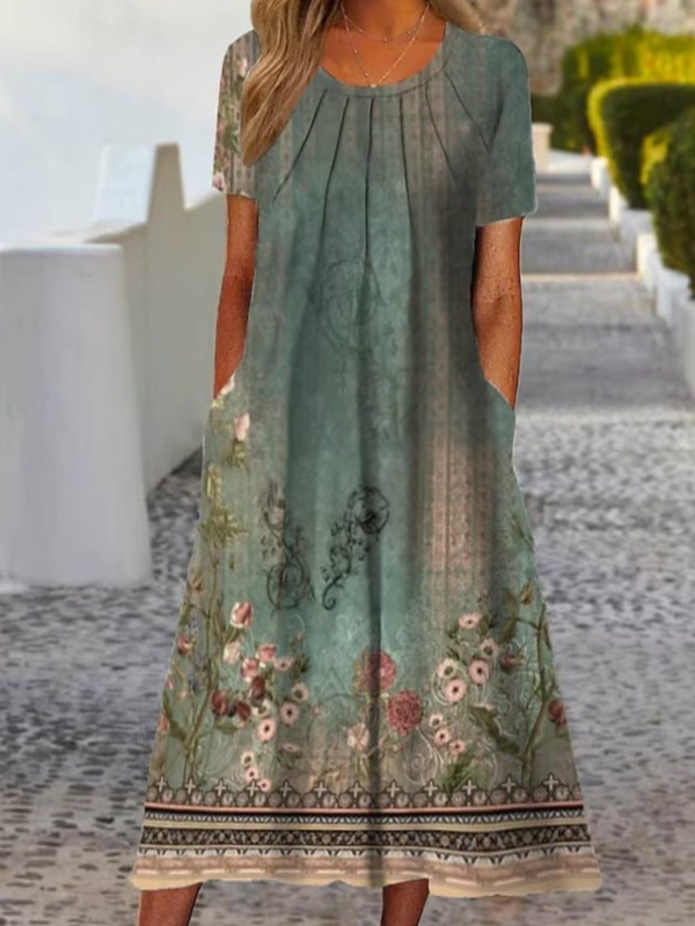 Floral Print Pintuck Dress, Vacation Style Pocket Short Sleeve Crew Neck Midi Dress