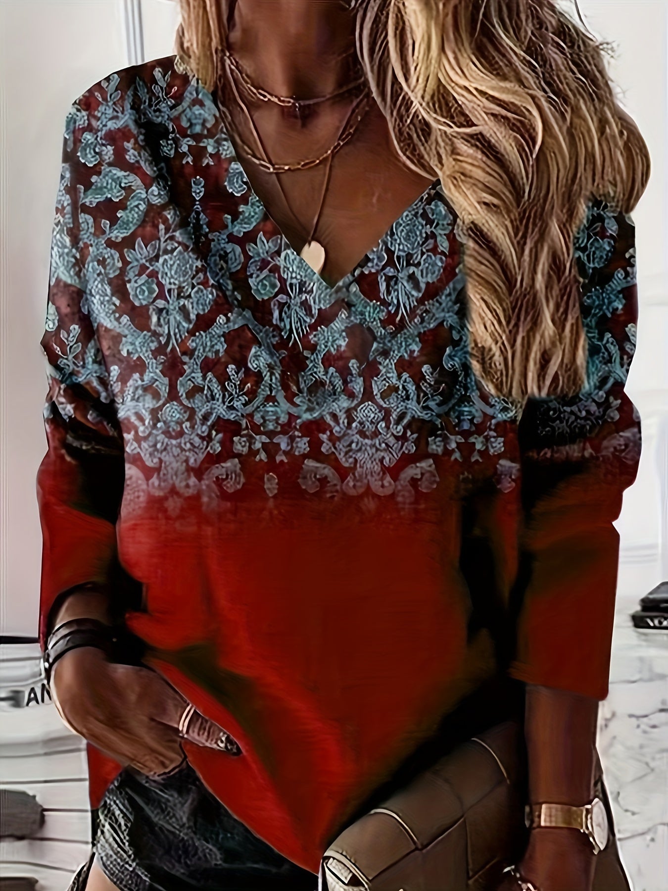 Floral Print Pullover Sweatshirt, Casual Long Sleeve V-neck Sweatshirt