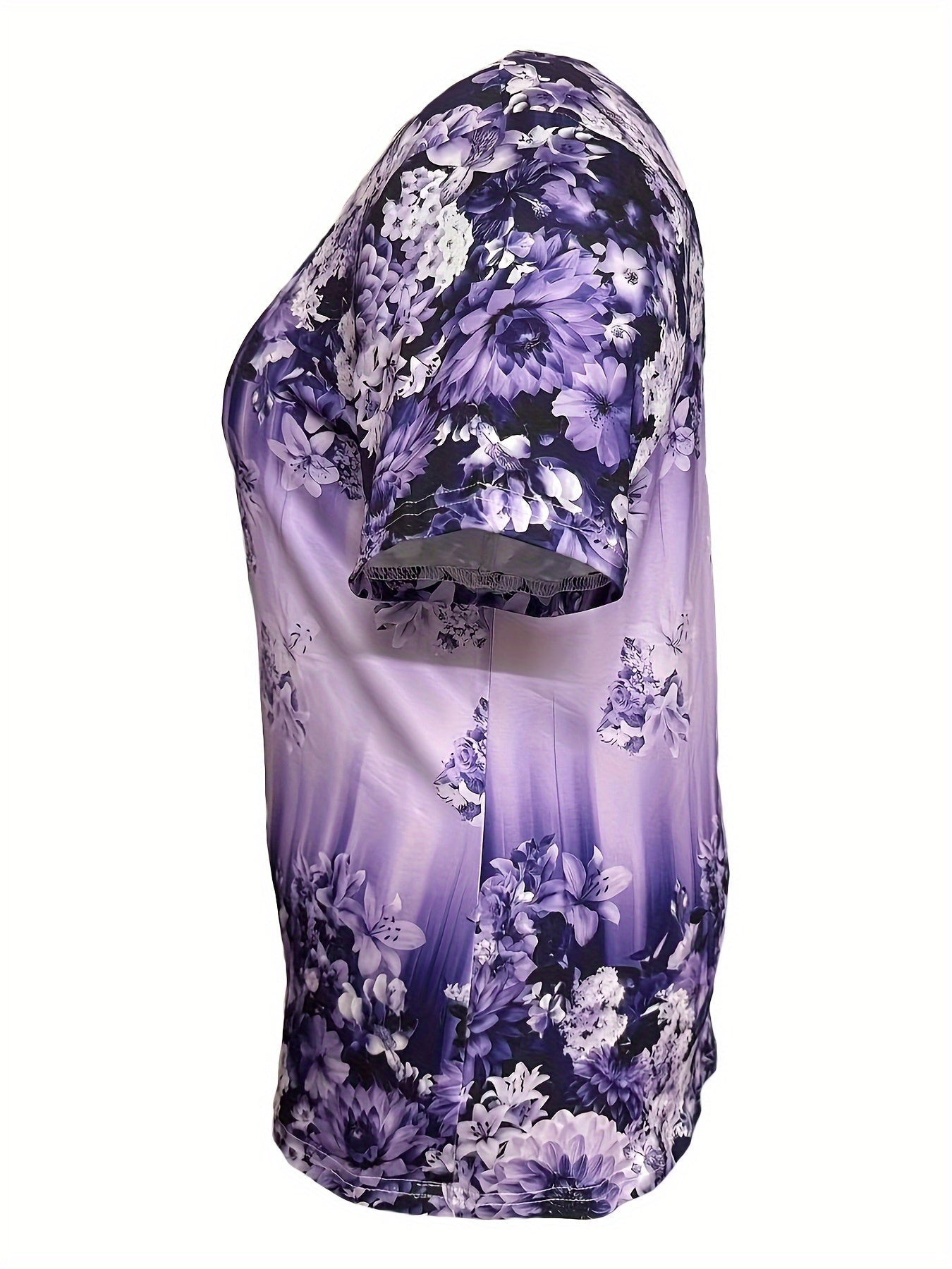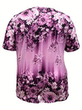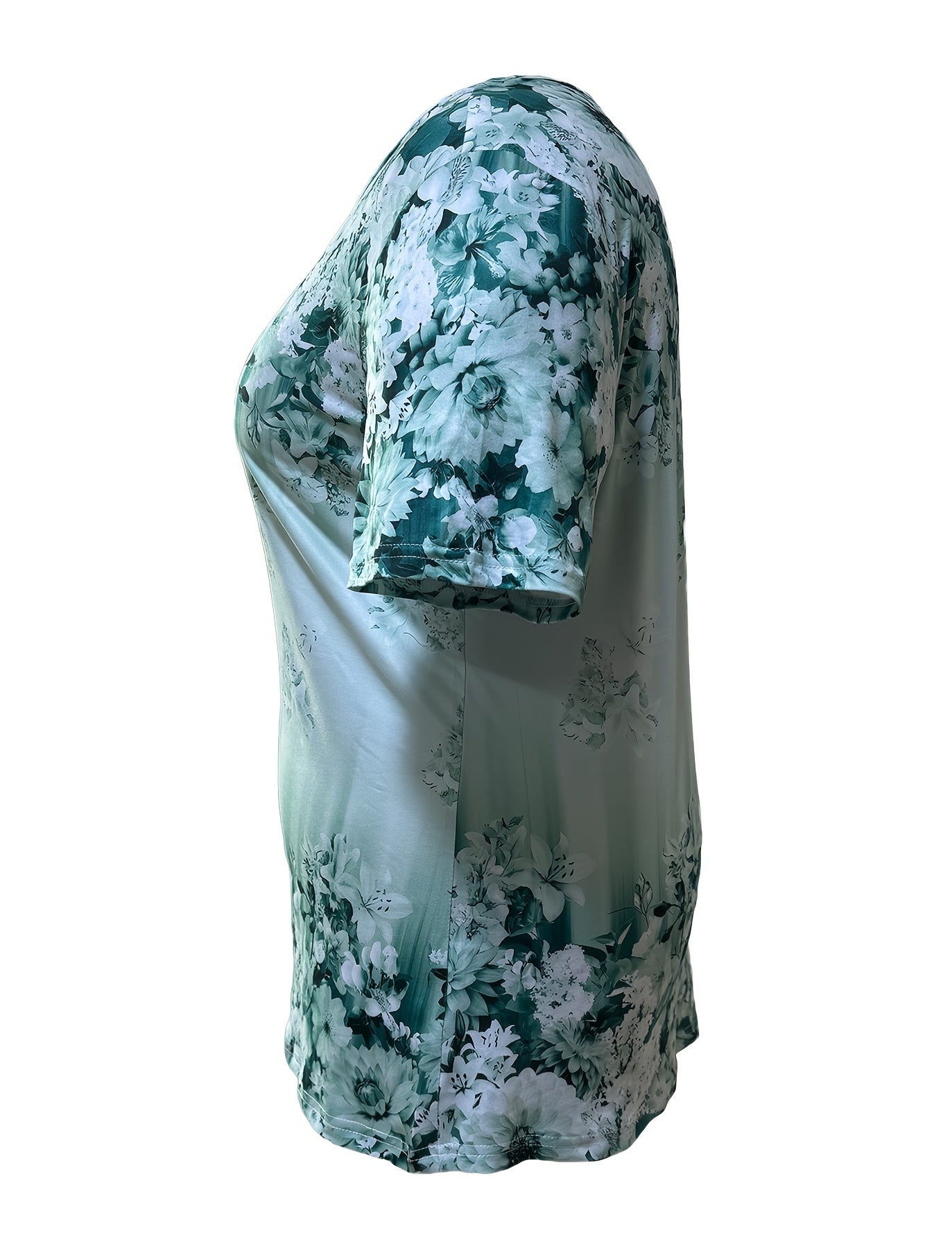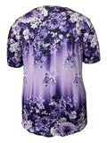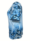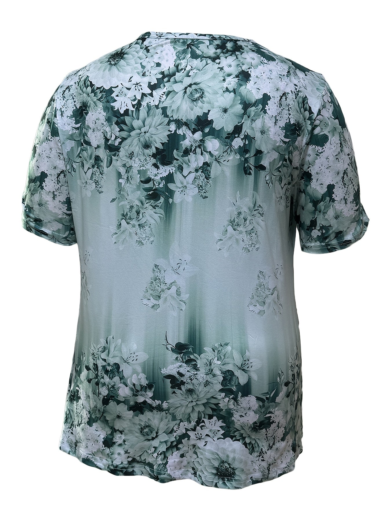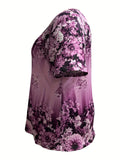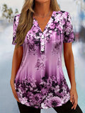 Slight Stretch Button Detail Flower Print V-Neck T-Shirt